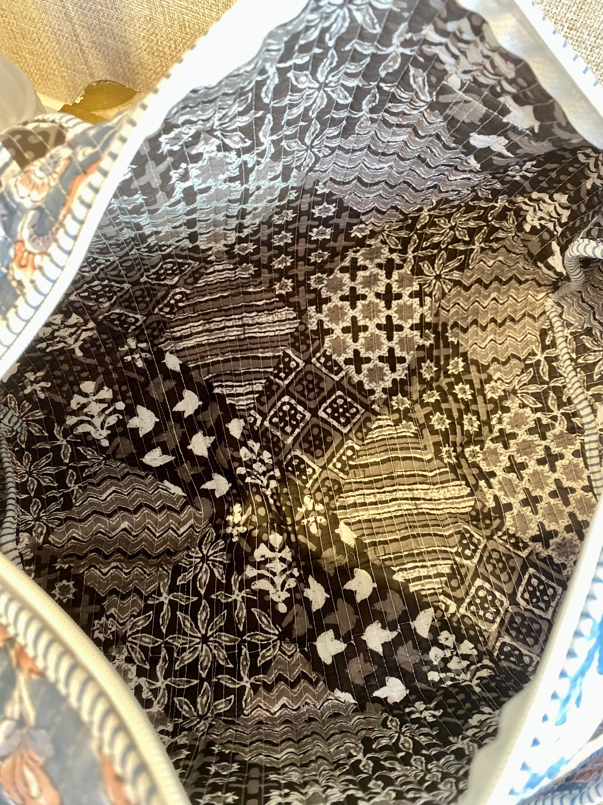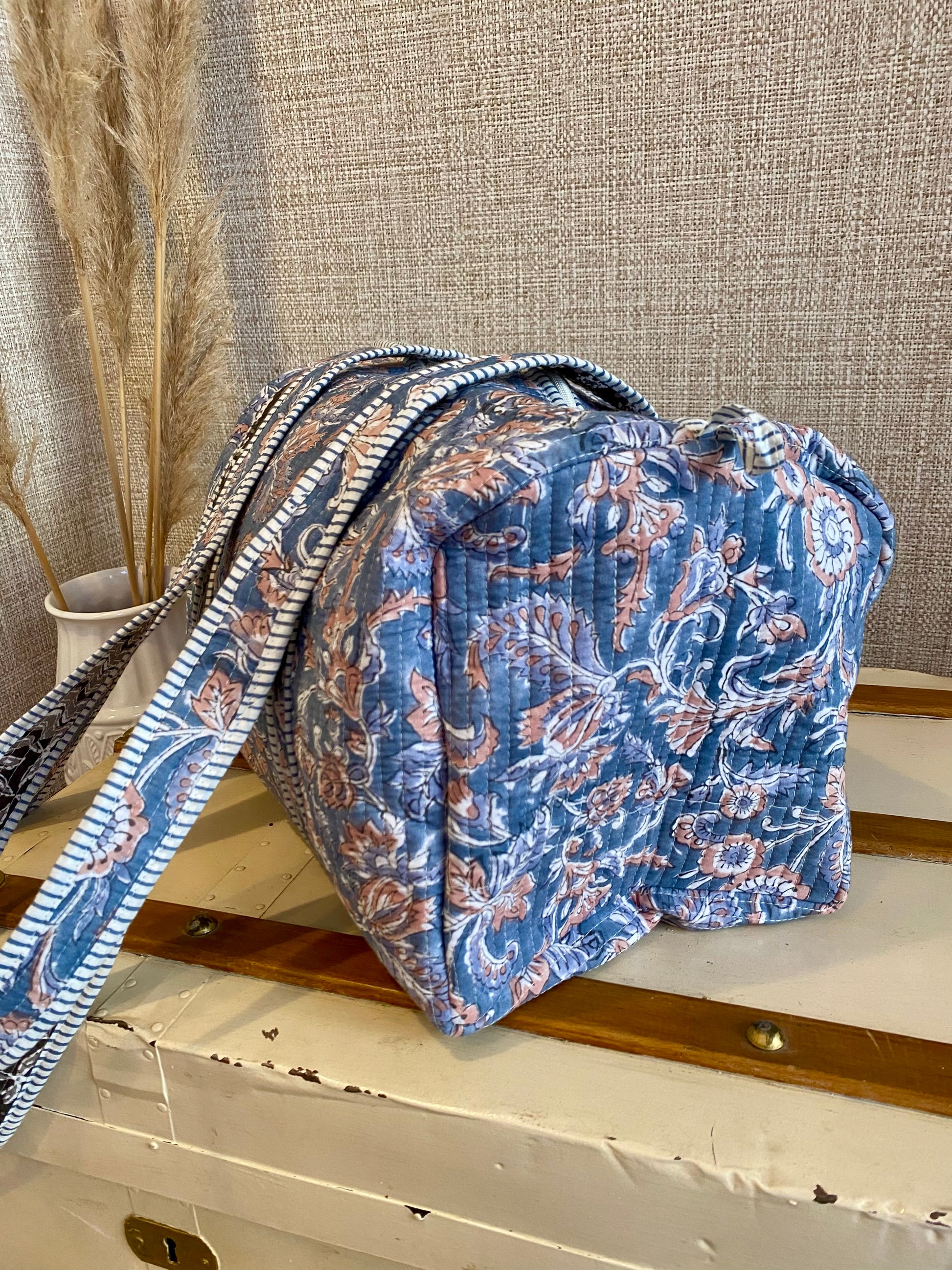 Ontdek deze prachtige, handgemaakte, gewatteerde weekendtas, zorgvuldig uitgekozen tijdens mijn reis naar India 😍. Met een geweldig patroon, zowel aan de binnen- als buitenkant, brengt deze tas kleur en stijl in elk avontuur. Prachtige bruine/beige bloemen op een blauwe achtergrond en van binnen een gaaf donkerbruin/zwart design. Door de lange hengsels (110 cm) kan het ook als luiertas voor aan de kinderwagen gebruikt worden.