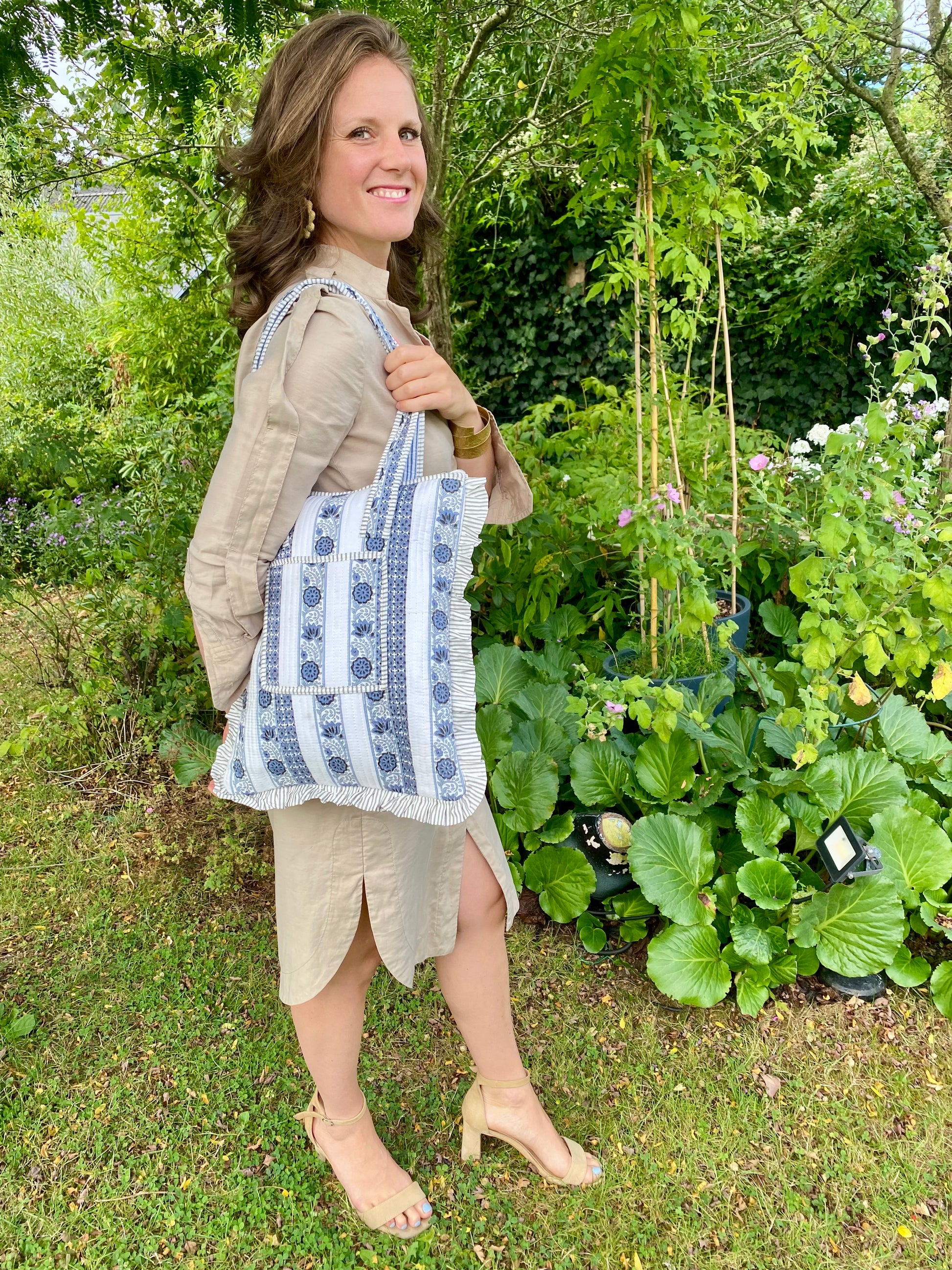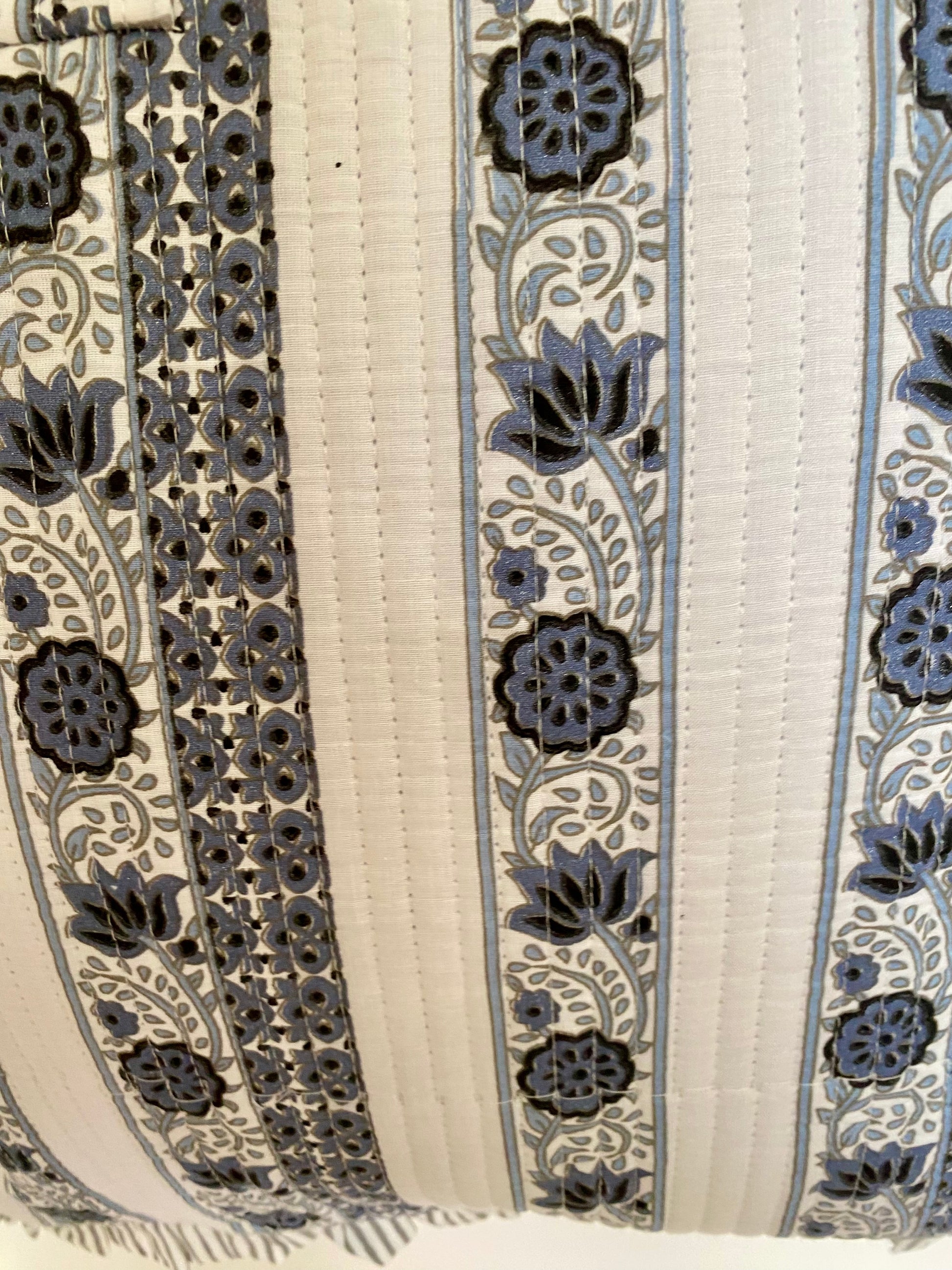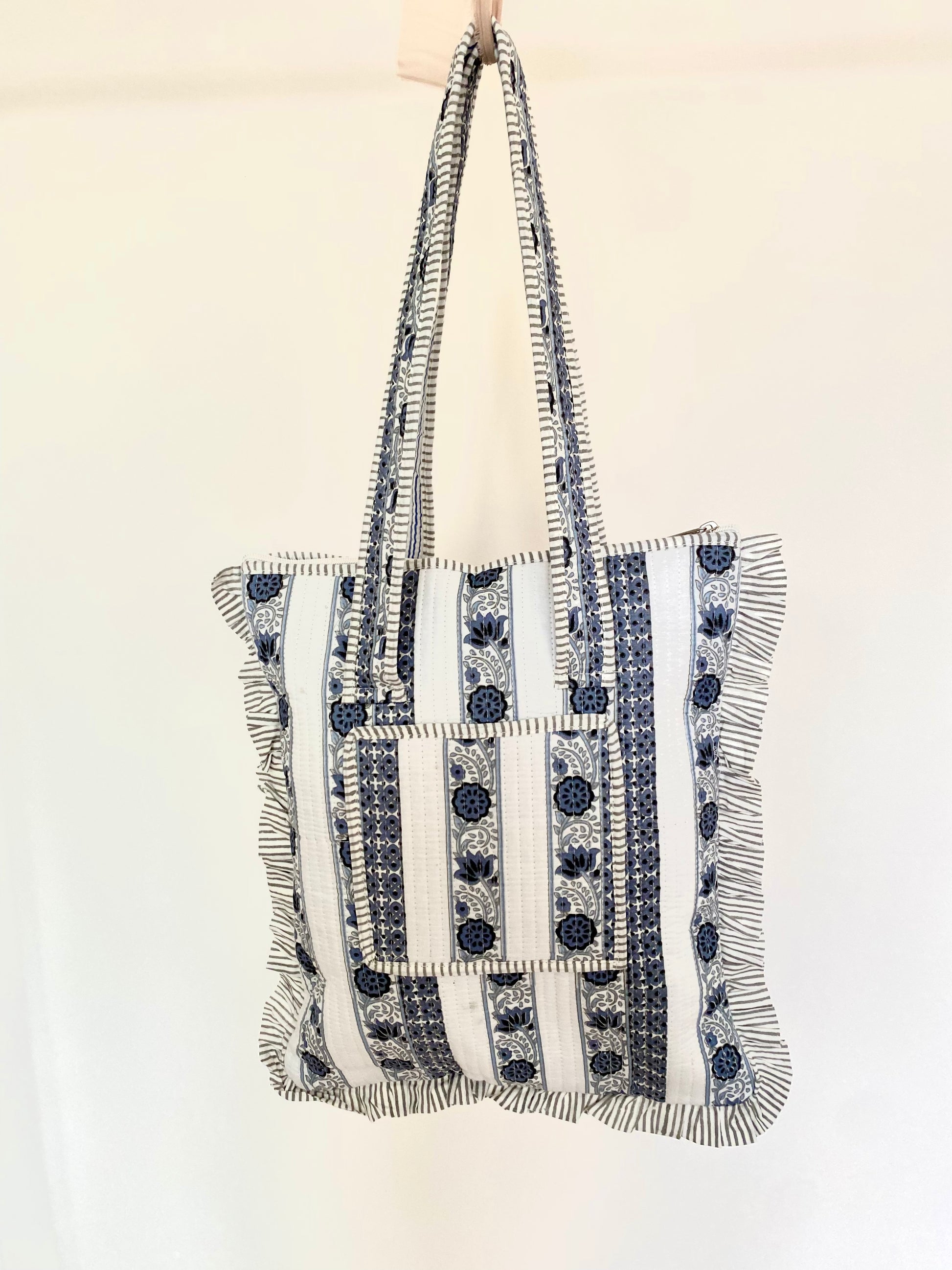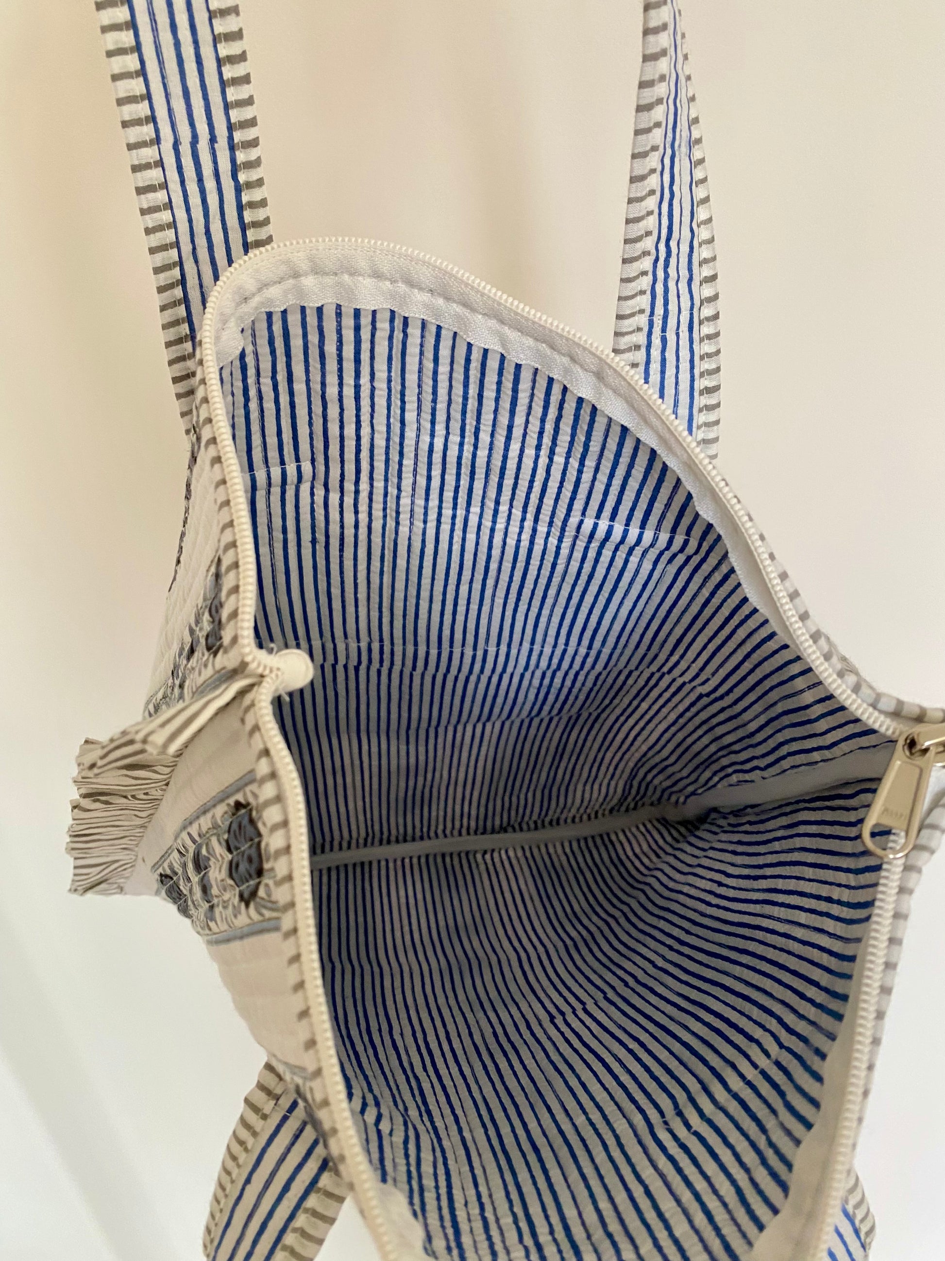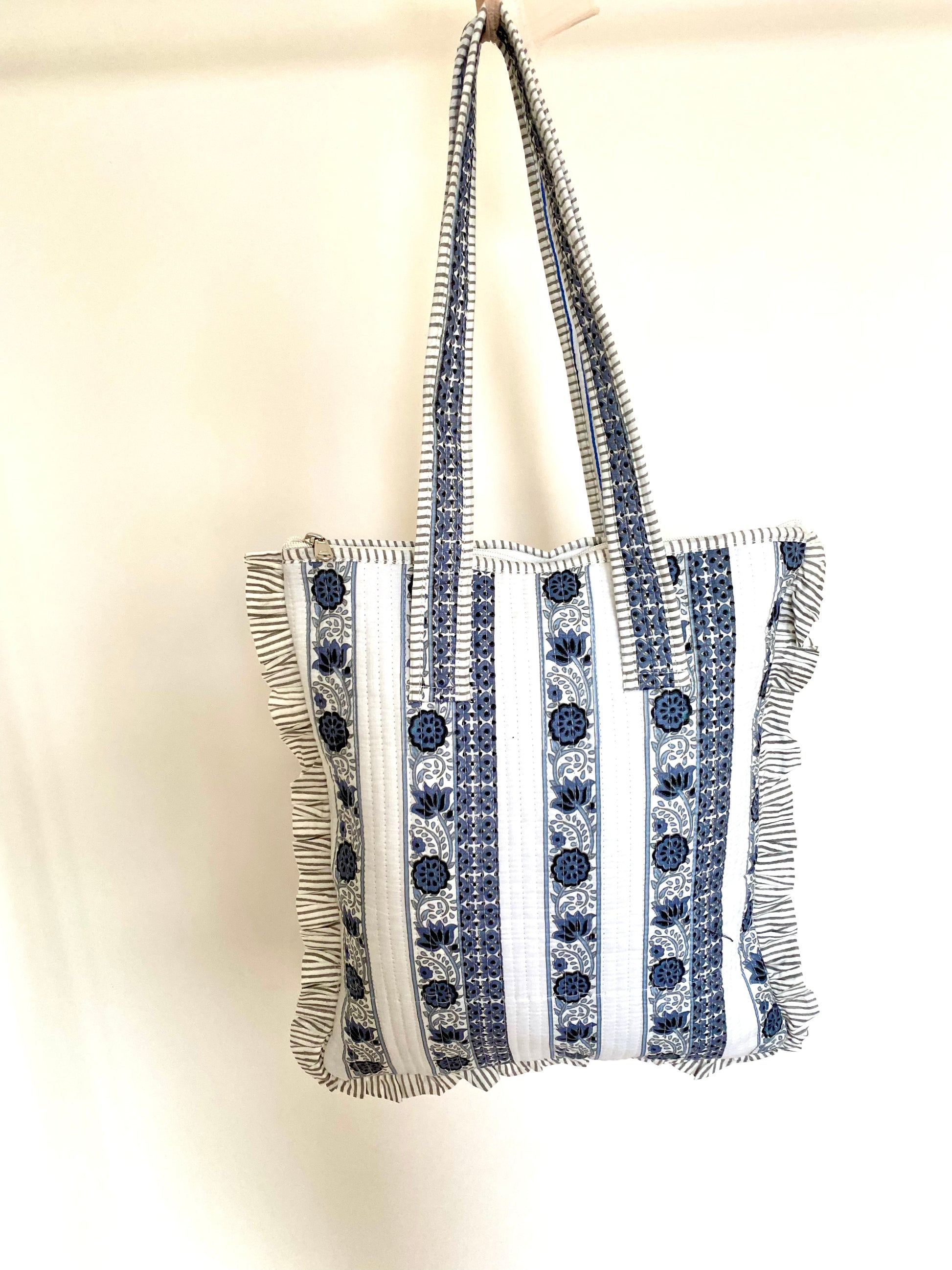 Deze mooie, gewatteerde laptoptas is handgemaakt en handbestempeld (block printed) in India. De tas heeft zowel een prachtige buitenkant als een mooie binnenkant én leuke franjes als rand. Met een kleine, subtiele zilveren glitter in de blauwe verf. Ook ideaal als handtas!