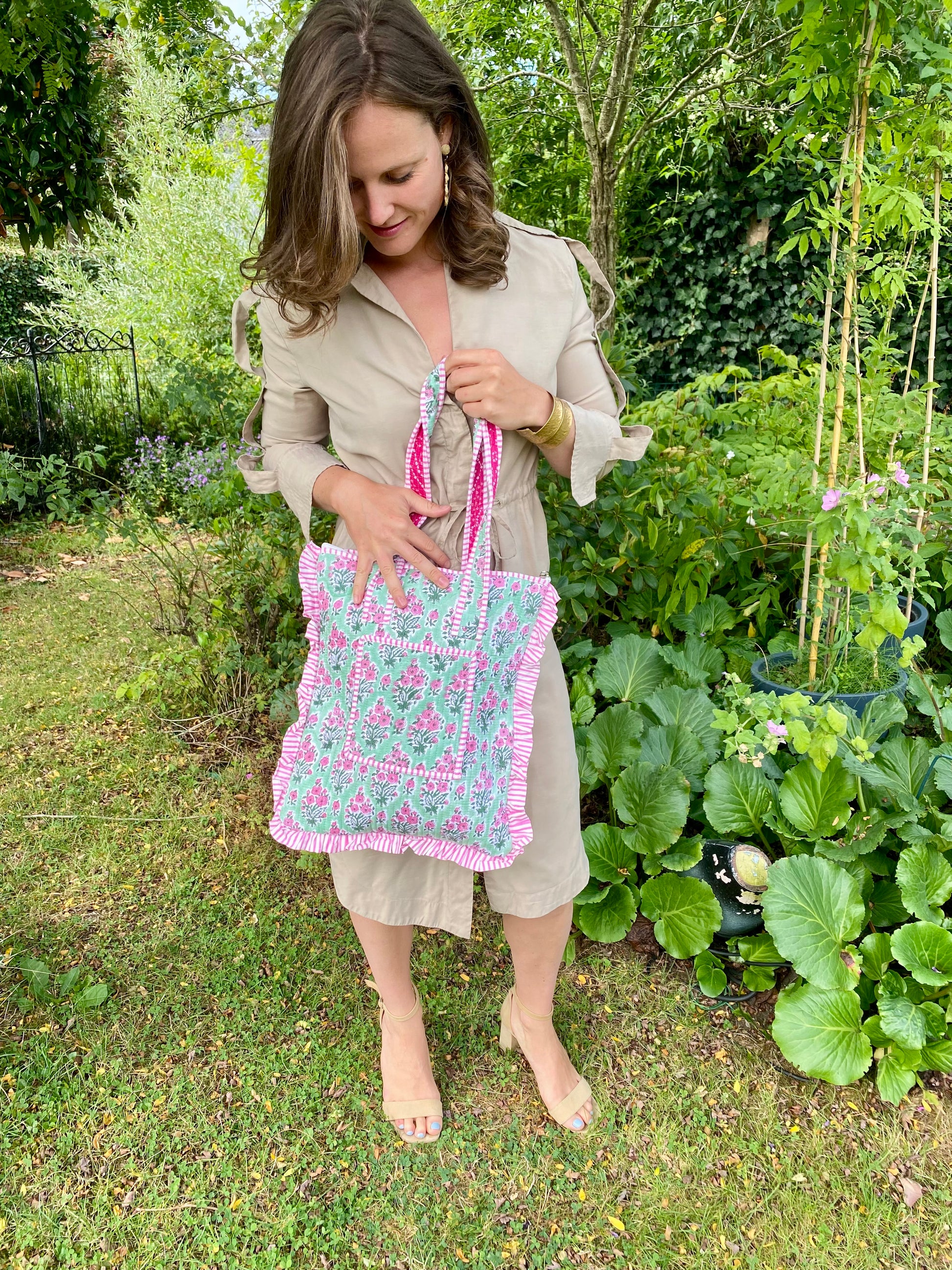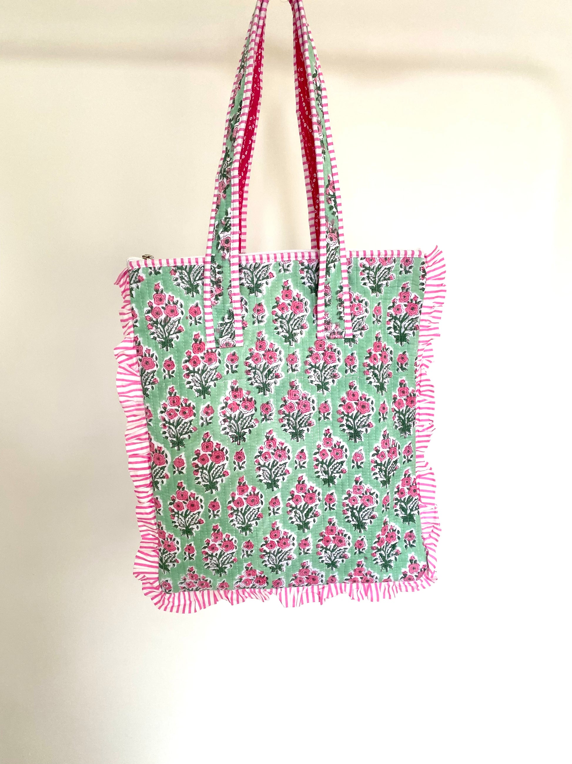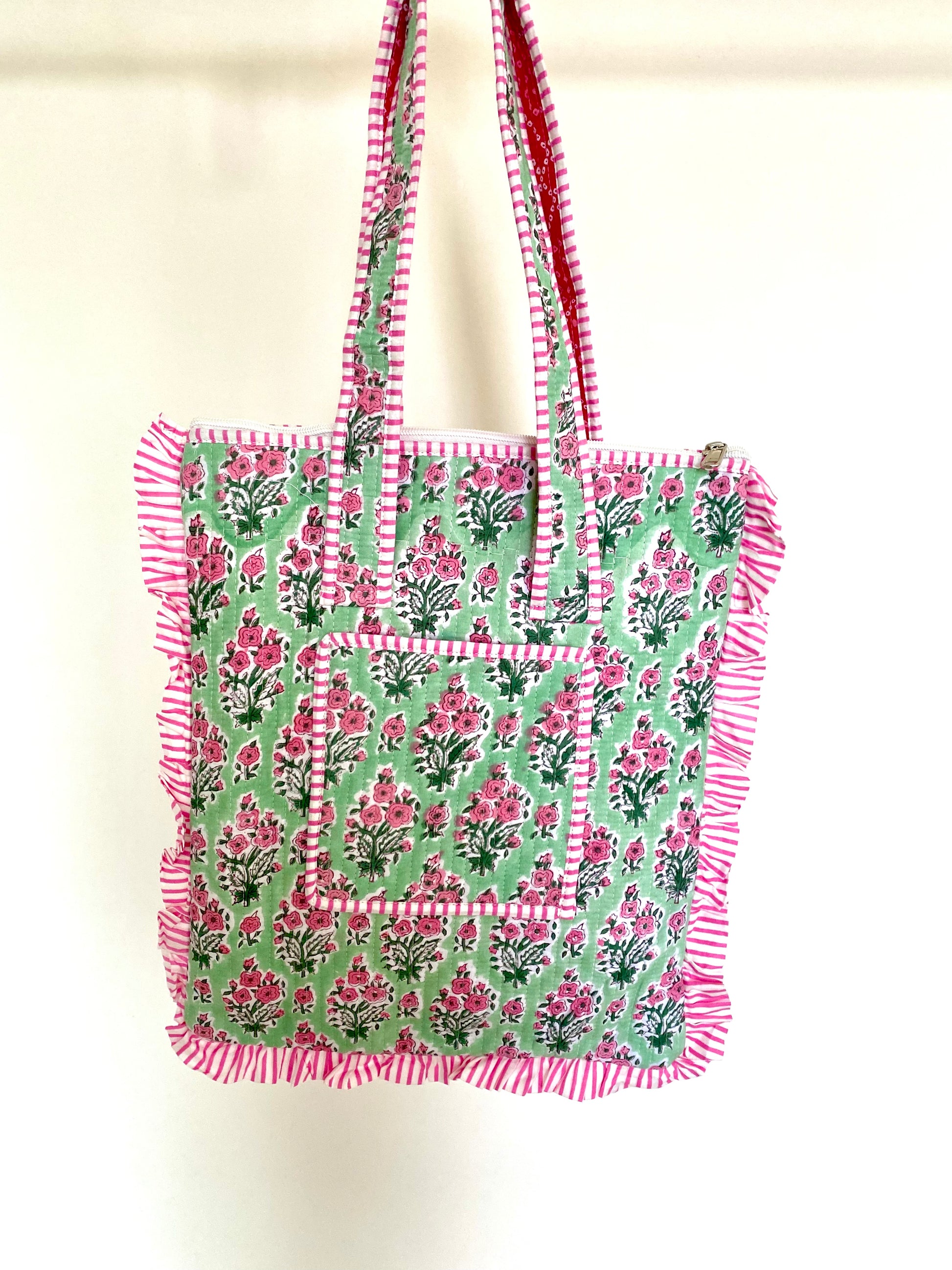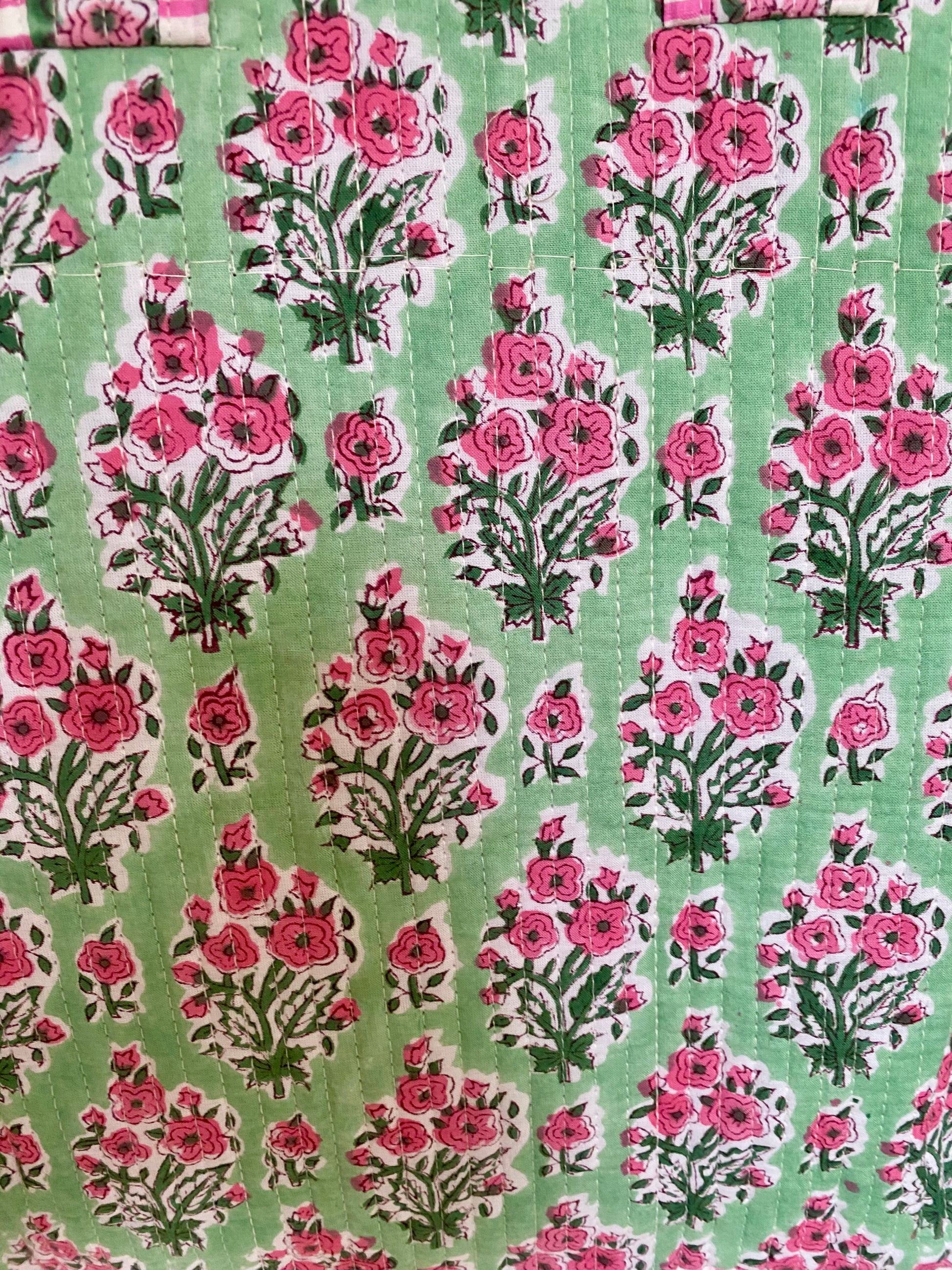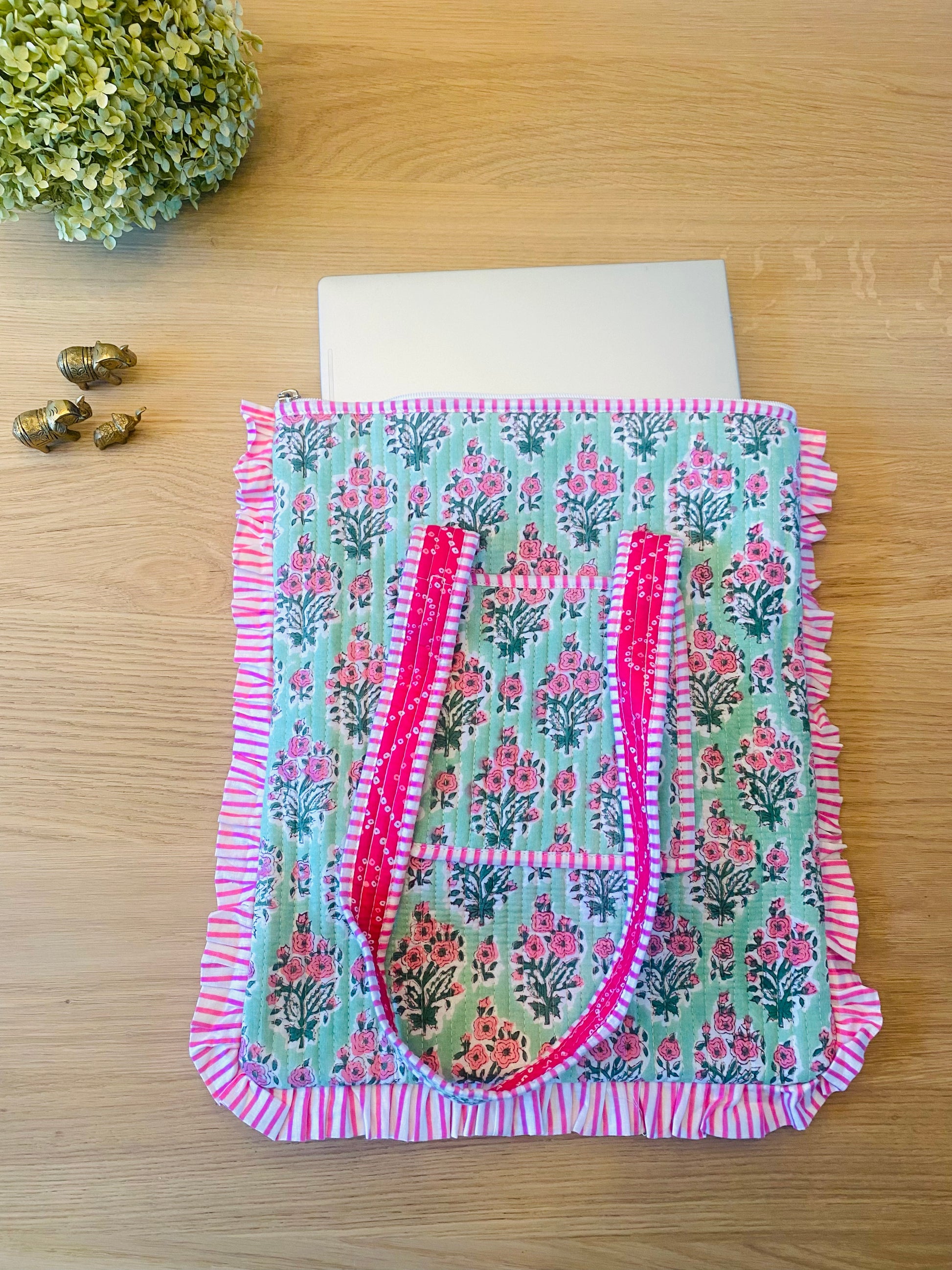 Deze mooie, gewatteerde laptoptas is handgemaakt en handbestempeld (block printed) in India. De tas heeft zowel een prachtige buitenkant als een mooie binnenkant én leuke franjes als rand. Prachtige roze rozen met een lichtgroene achtergrond. Ook ideaal als handtas.