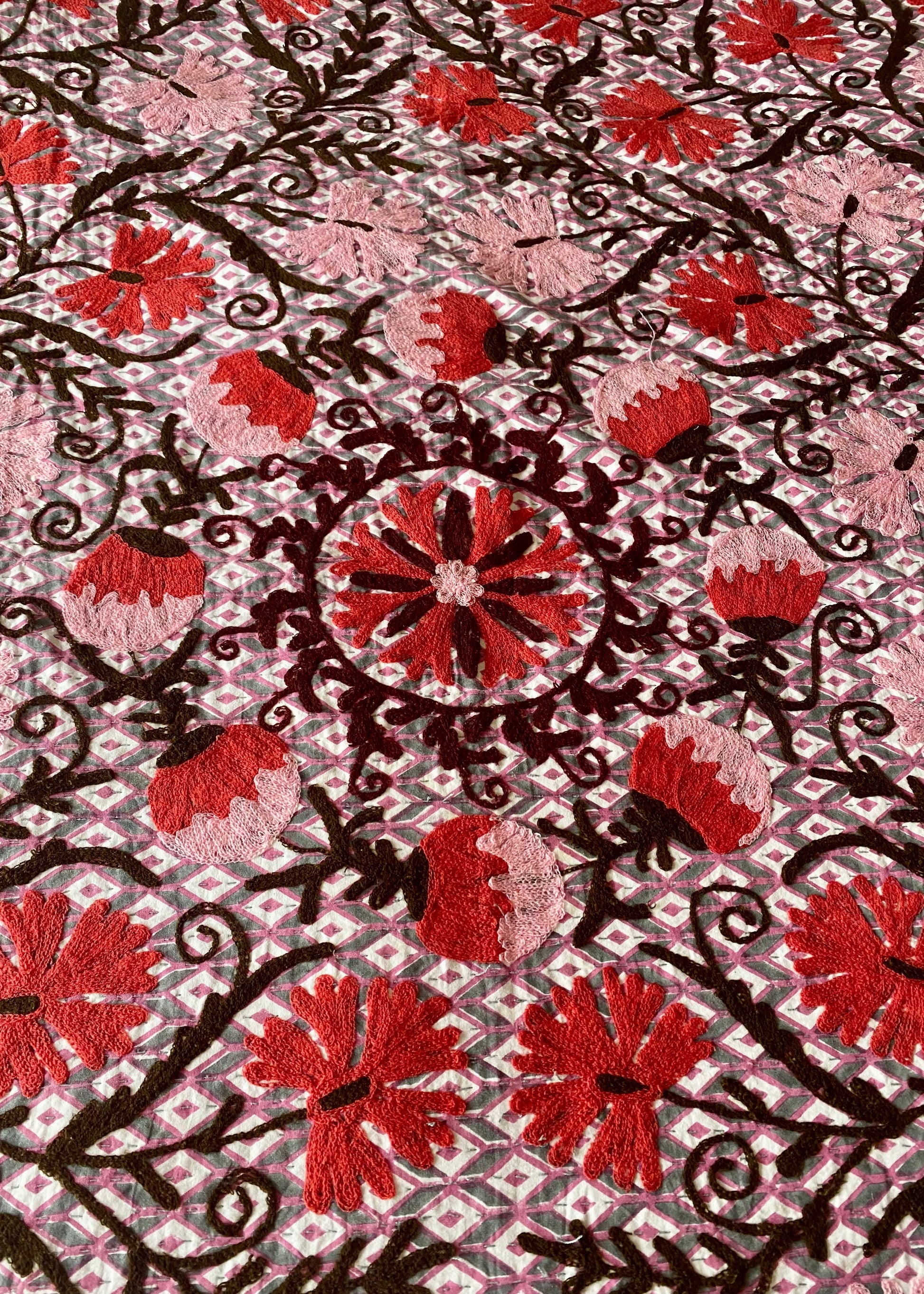 De grijs/roze handbestempelde ondergrond vormt een ruitjespatroon waarop met de hand geborduurde bloemen tot leven komen. Zowel een prachtige voor- als achterzijde.