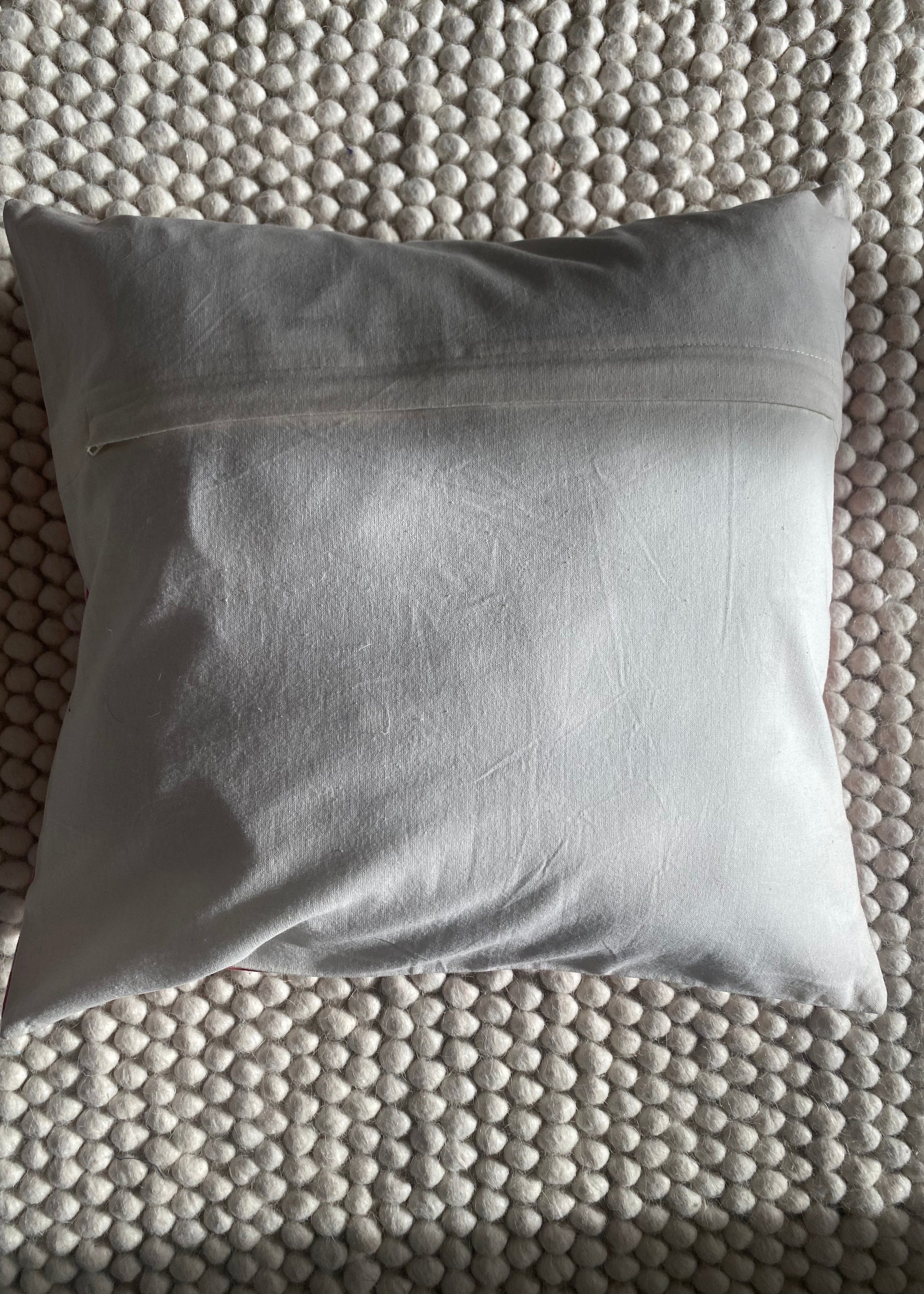 Het unieke roze en blauw bloemenpatroon is met de hand aangebracht met houten stempels, waardoor elk kussen een subtiele eigen uitstraling heeft. Dit maakt het een decoratief accent dat gezien mag worden in zowel een kleurrijk als een rustig interieur.
