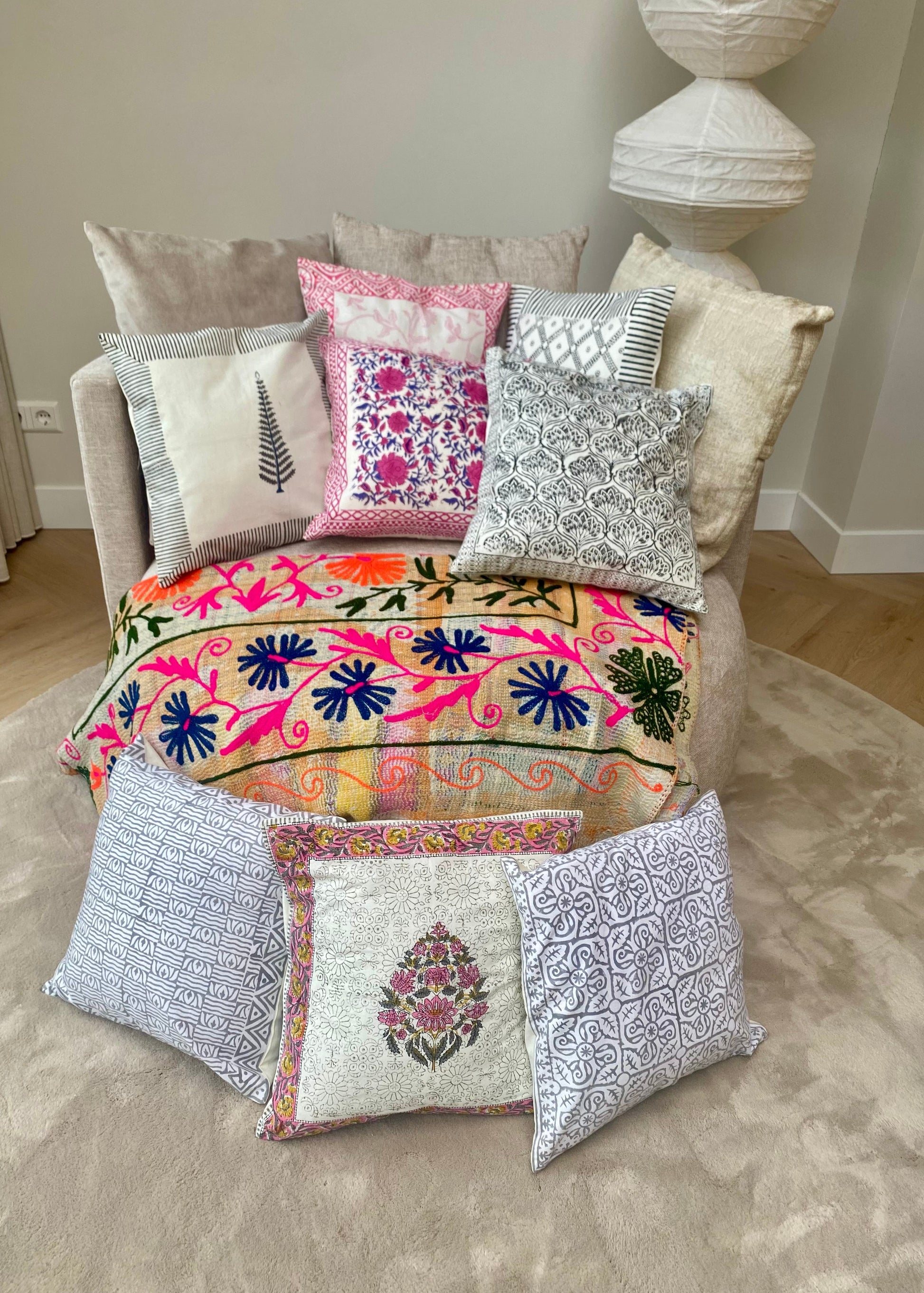 Het unieke roze patroon is met de hand aangebracht met houten stempels, waardoor elk kussen een subtiele eigen uitstraling heeft. Dit maakt het een decoratief accent dat gezien mag worden in zowel een kleurrijk als een rustig interieur.