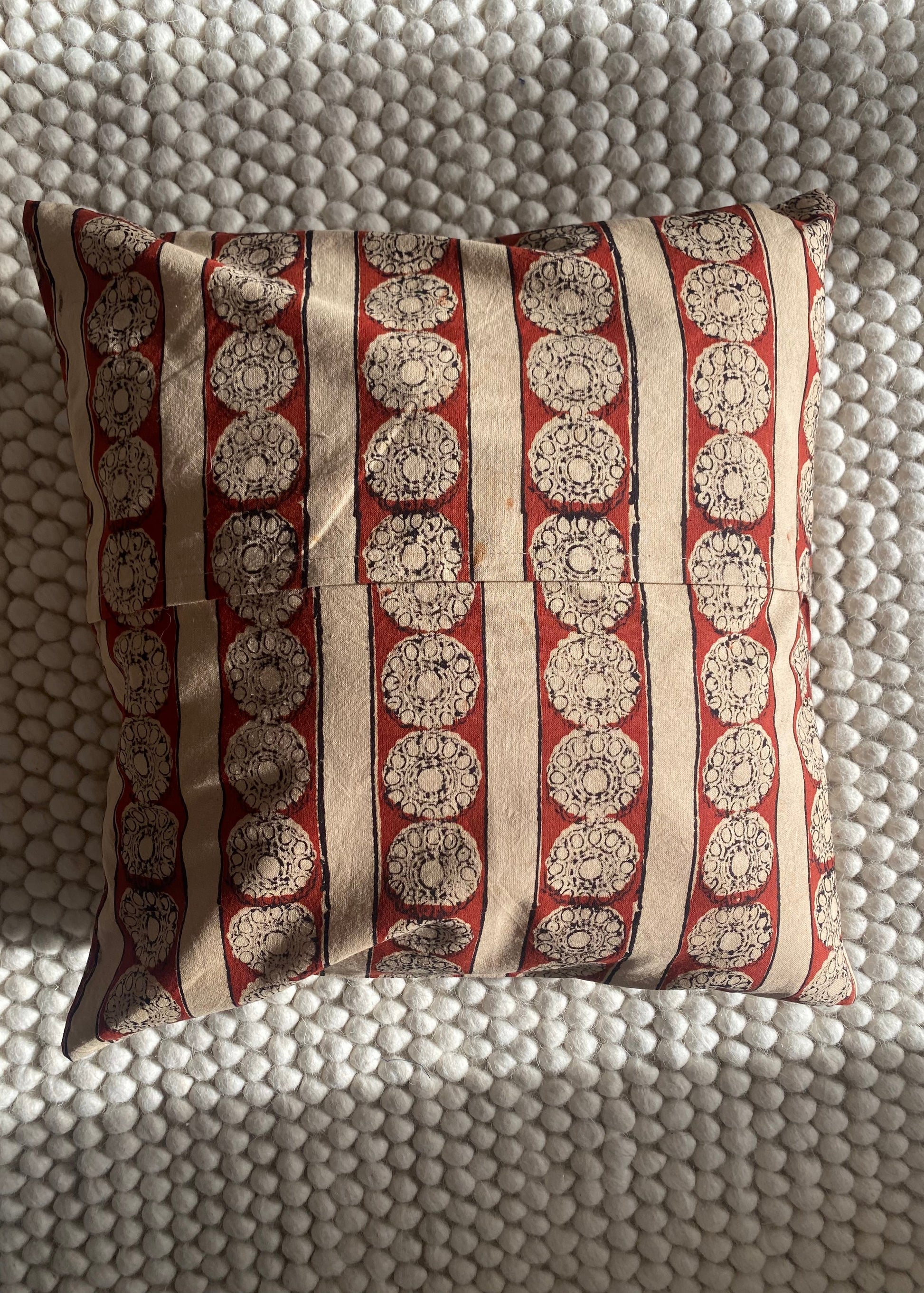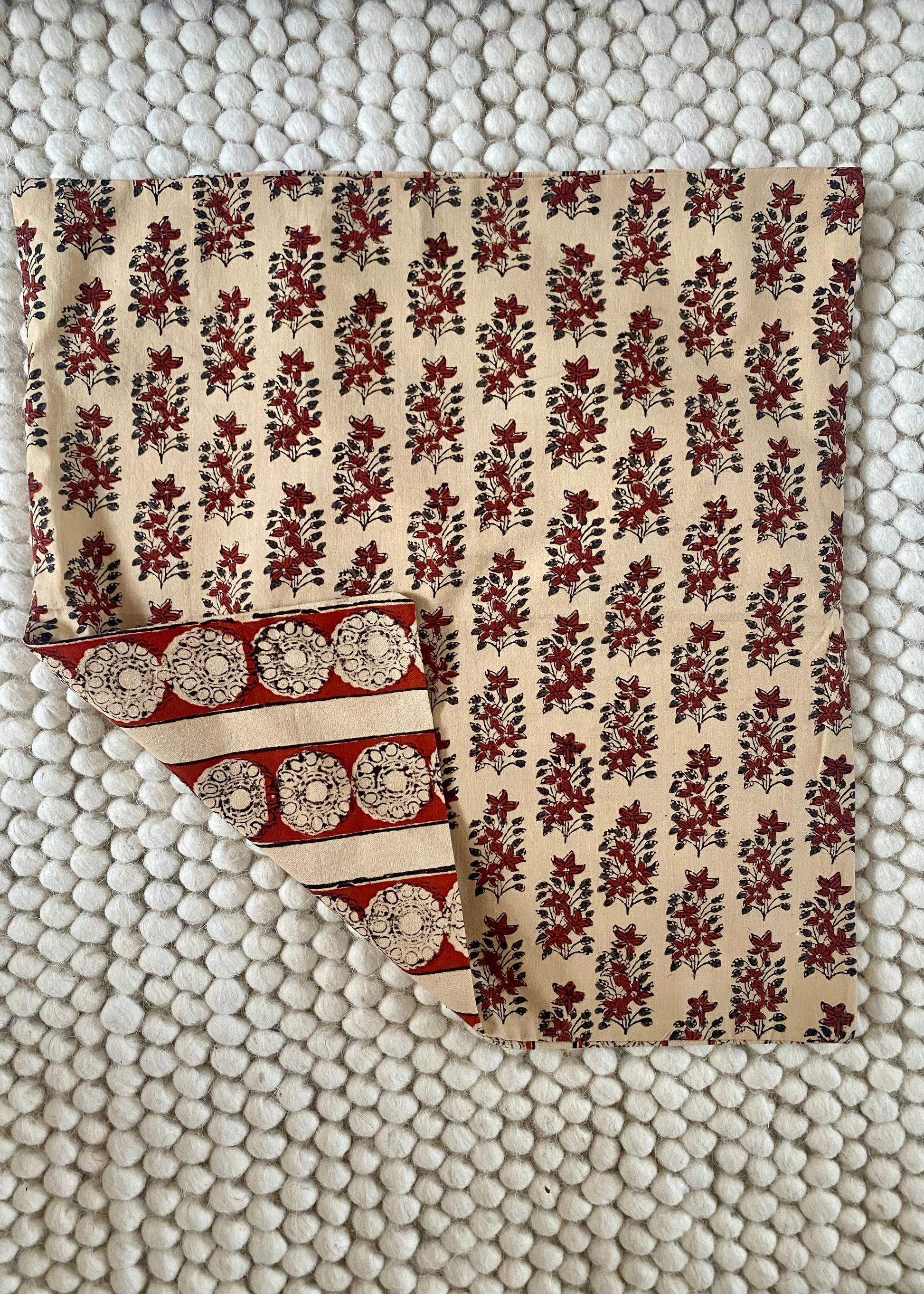 Het unieke, symmetrische patroon is met de hand aangebracht met houten stempels, waardoor elk kussen een subtiele eigen uitstraling heeft. Met een prachtige voorkant van rood-bruine bloemen en een zwart/rood-bruine symmetrische achterkant. Dit maakt het een decoratief accent dat gezien mag worden in zowel een kleurrijk als een rustig interieur.