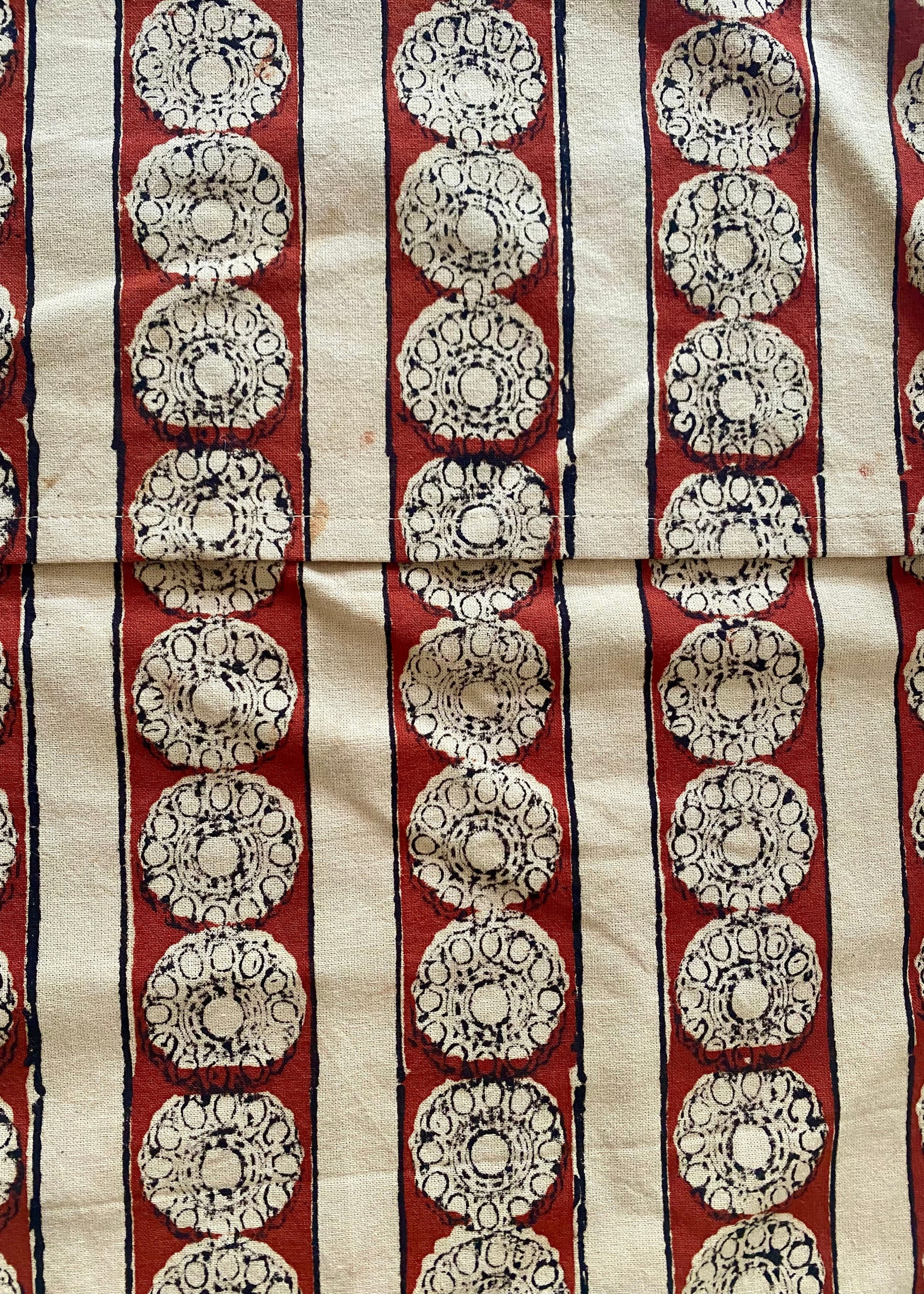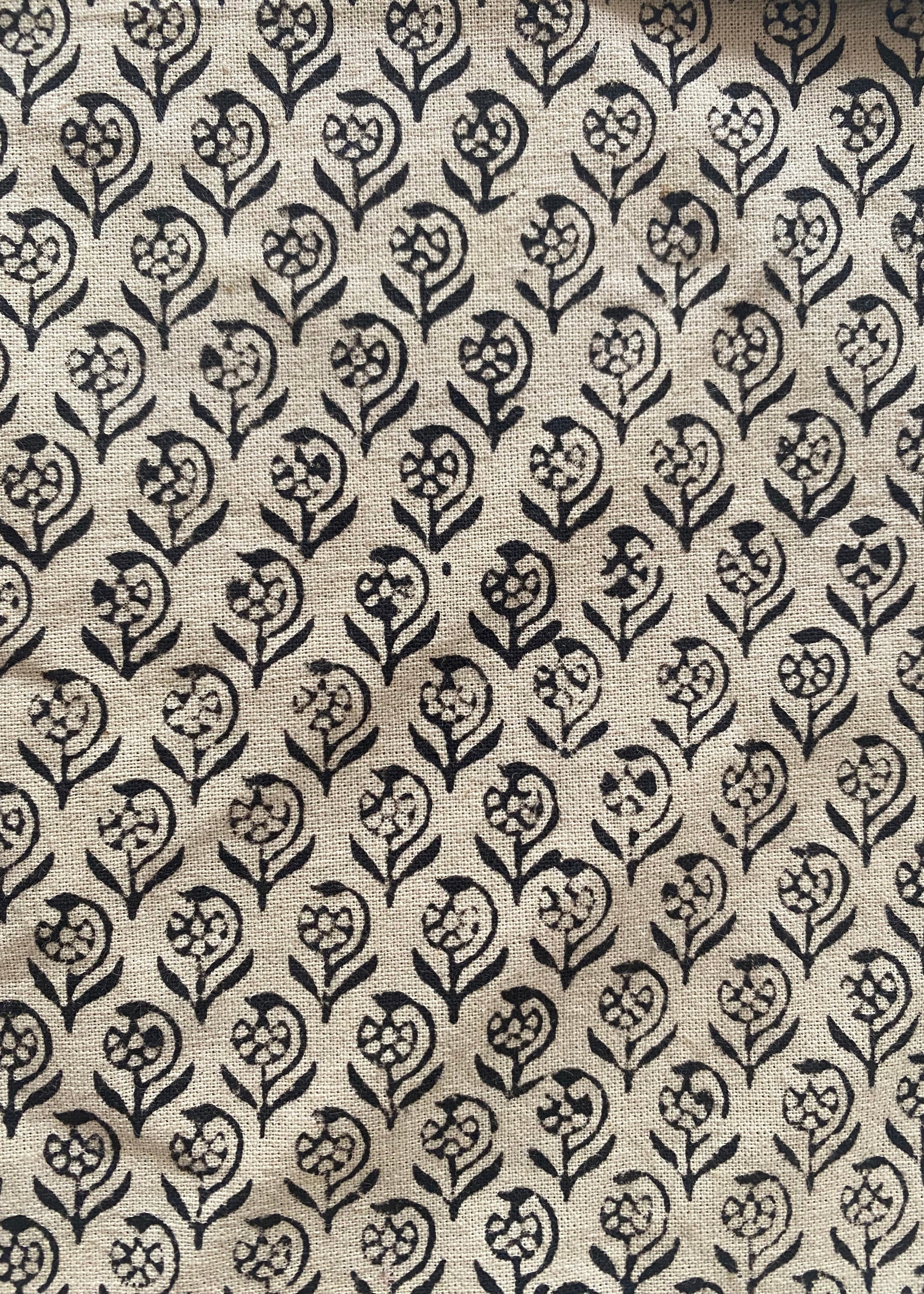 Het unieke, symmetrische patroon is met de hand aangebracht met houten stempels, waardoor elk kussen een subtiele eigen uitstraling heeft. Met een prachtige zwart/beige bloemenvoorkant van rood-bruine achterkant. Dit maakt het een decoratief accent dat gezien mag worden in zowel een kleurrijk als een rustig interieur.