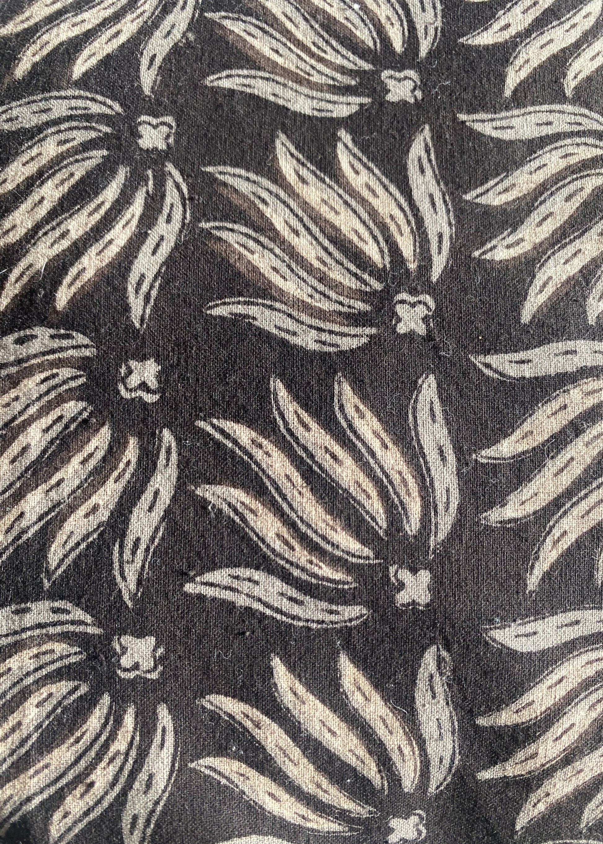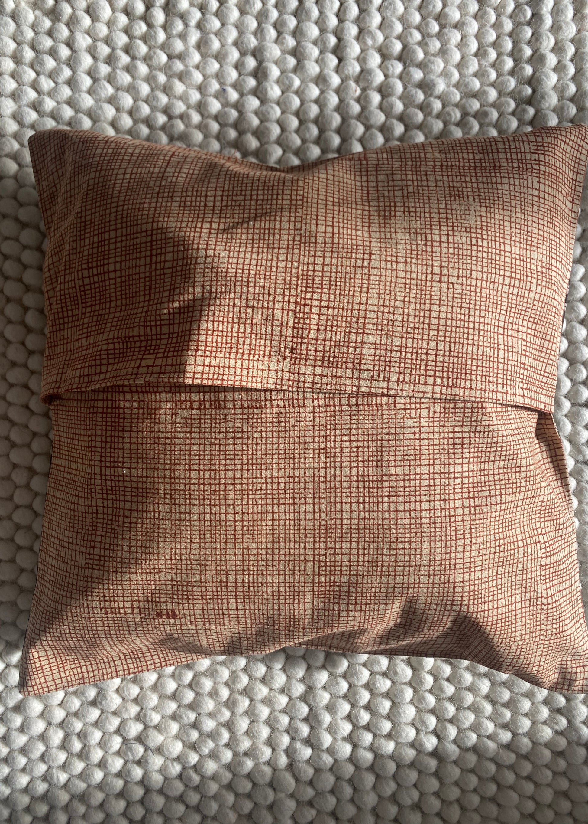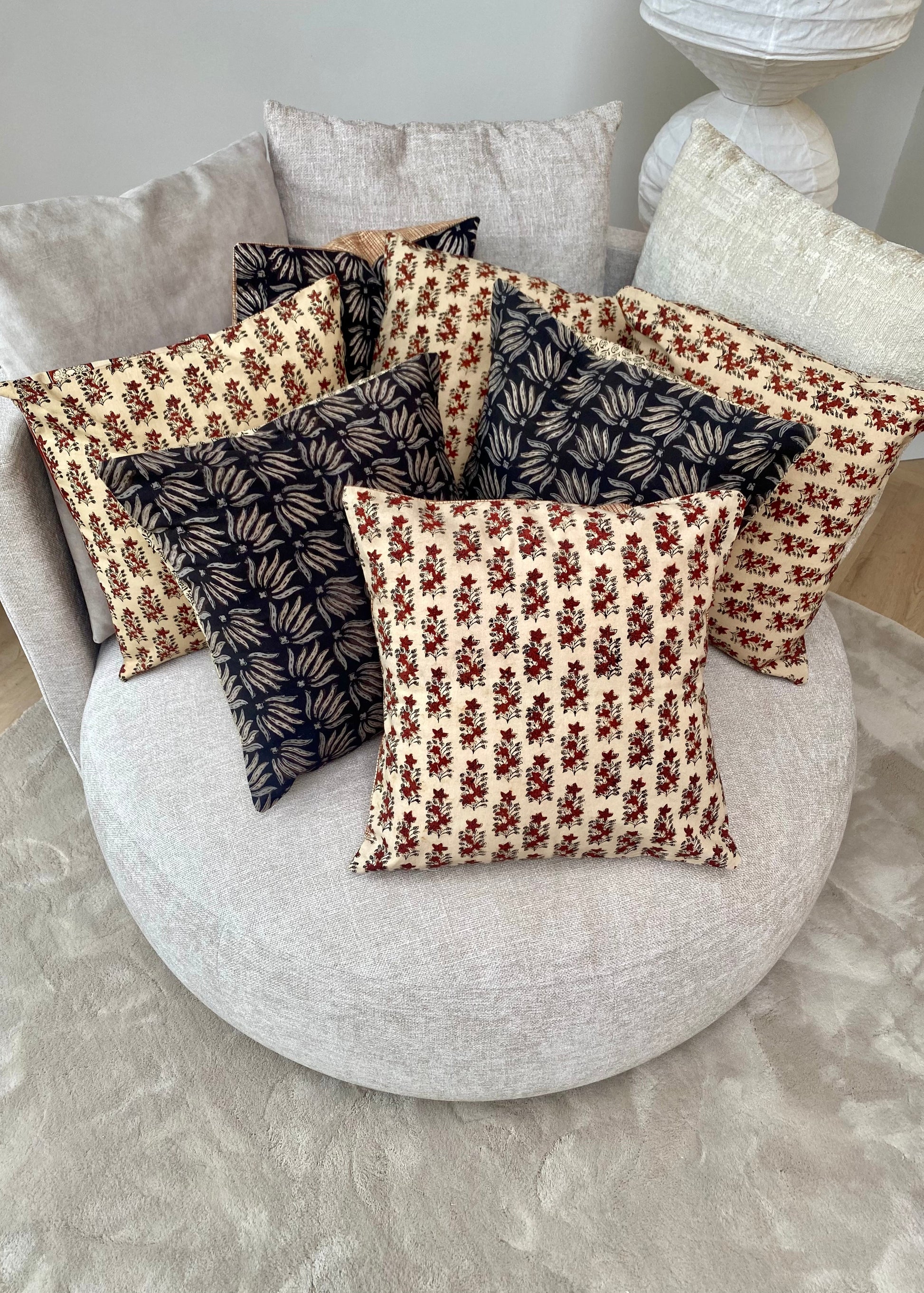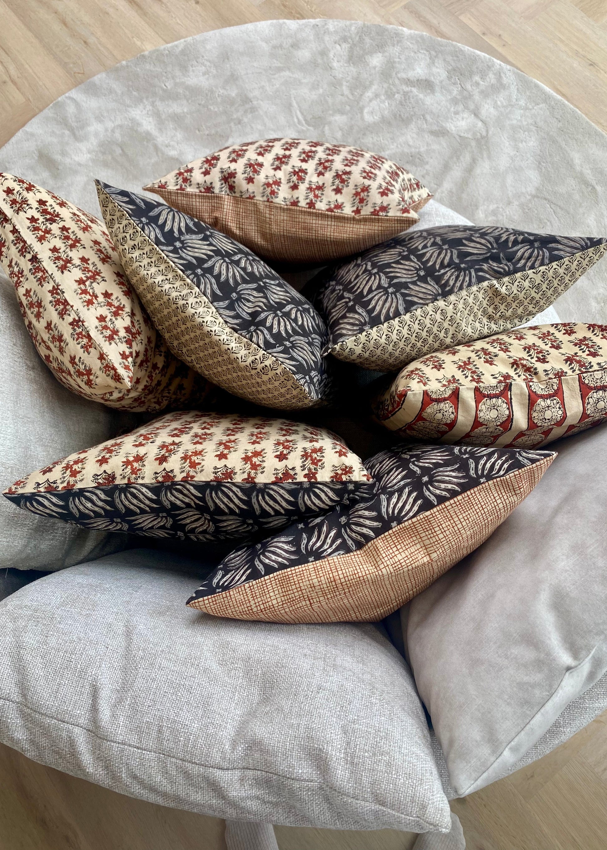 Het unieke, symmetrische patroon is met de hand aangebracht met houten stempels, waardoor elk kussen een subtiele eigen uitstraling heeft. Met een prachtige zwart/beige bloemenvoorkant van rood-bruine geruite achterkant. Dit maakt het een decoratief accent dat gezien mag worden in zowel een kleurrijk als een rustig interieur.