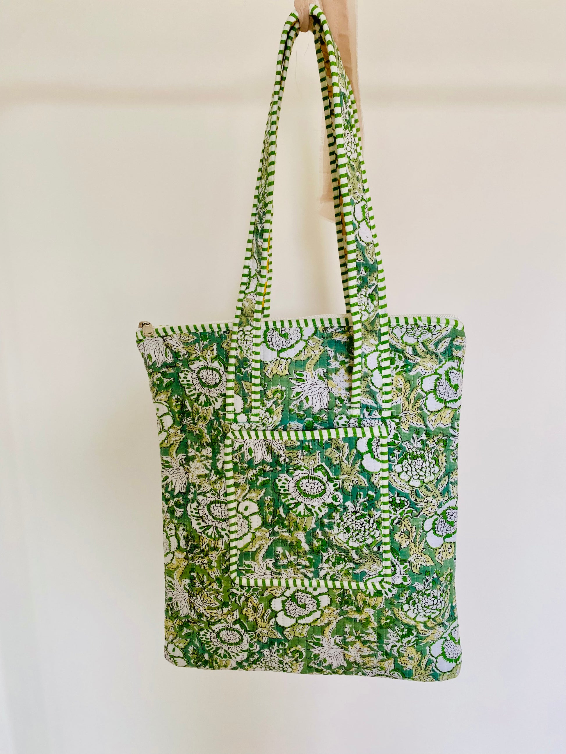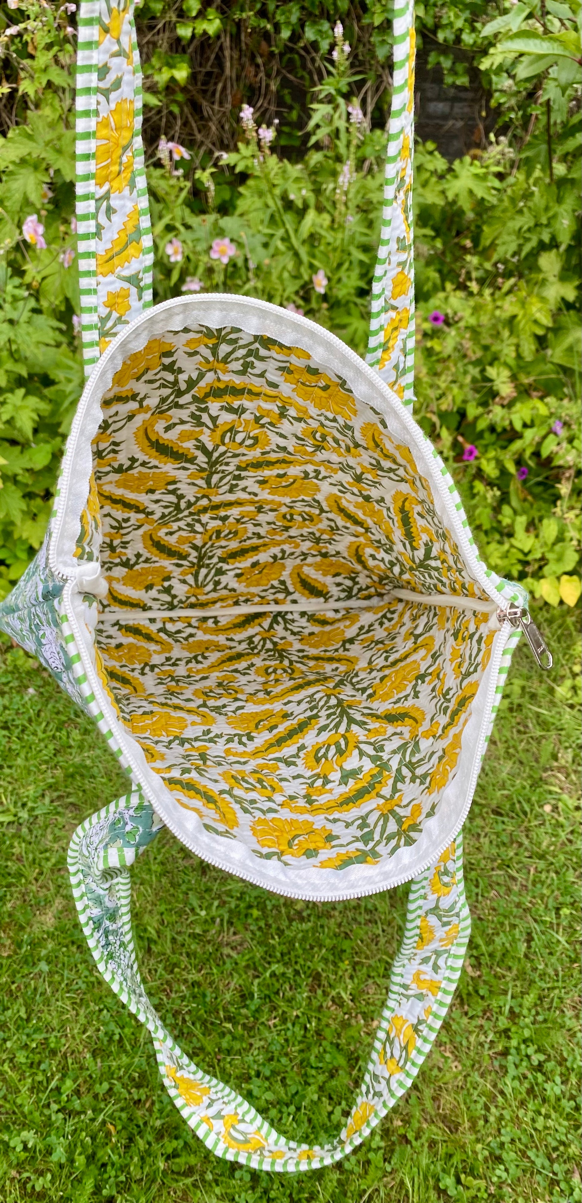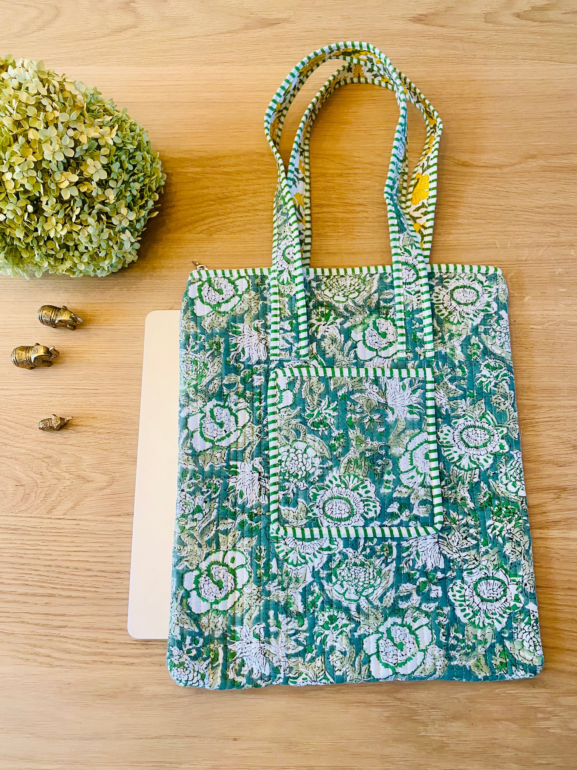 Deze mooie, gewatteerde laptoptas is handgemaakt in India. De tas heeft zowel een prachtige buitenkant als een mooie binnenkant: groene en gele bloemen. Ook ideaal als handtas!