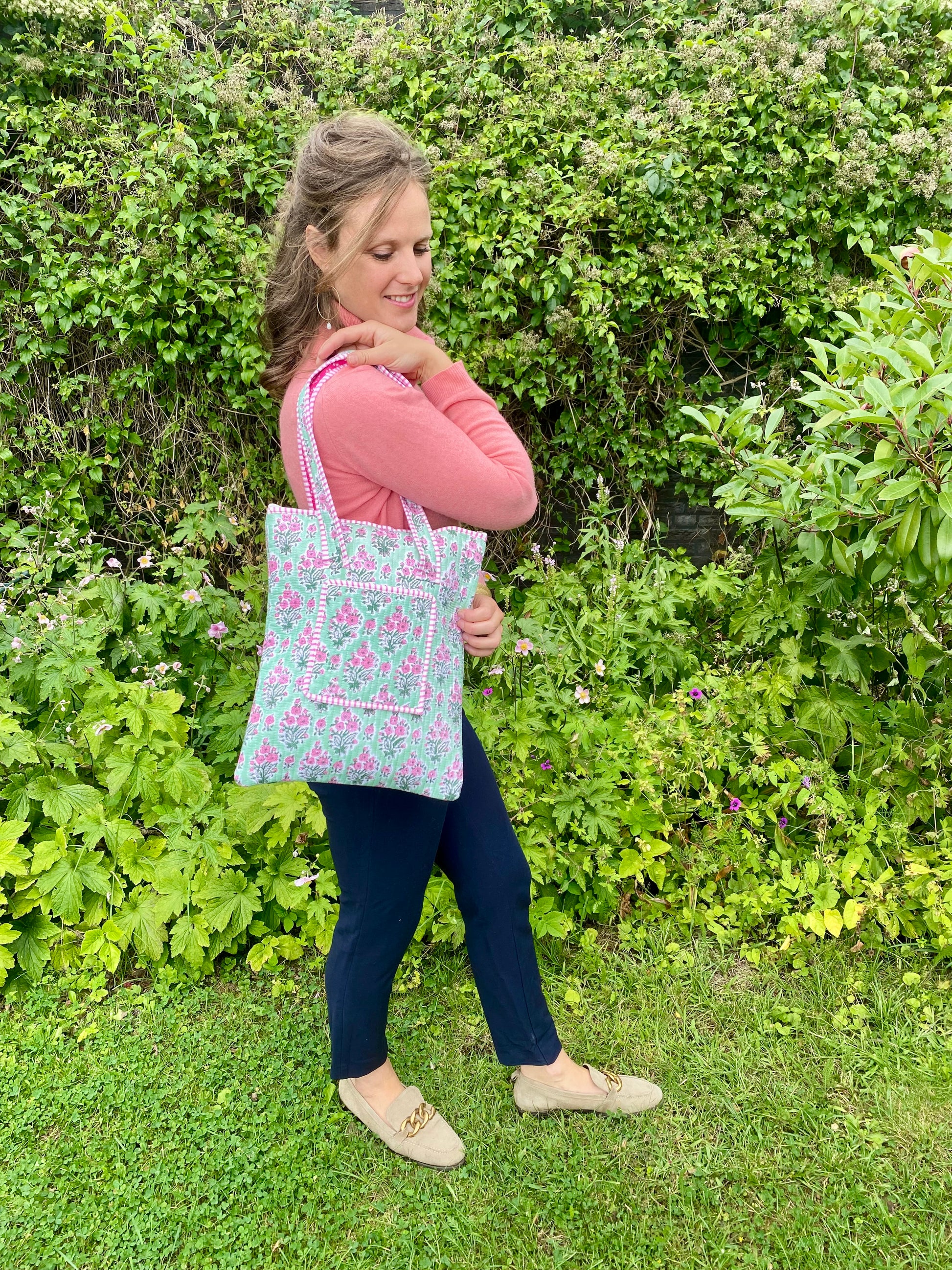 Deze mooie, gewatteerde laptoptas is handgemaakt en bedrukt met houten stempels in India. De tas heeft zowel een prachtige buitenkant als een mooie binnenkant. Van buiten: Roze rozen op een groene achtergrond. Van binnen een zoetroze.