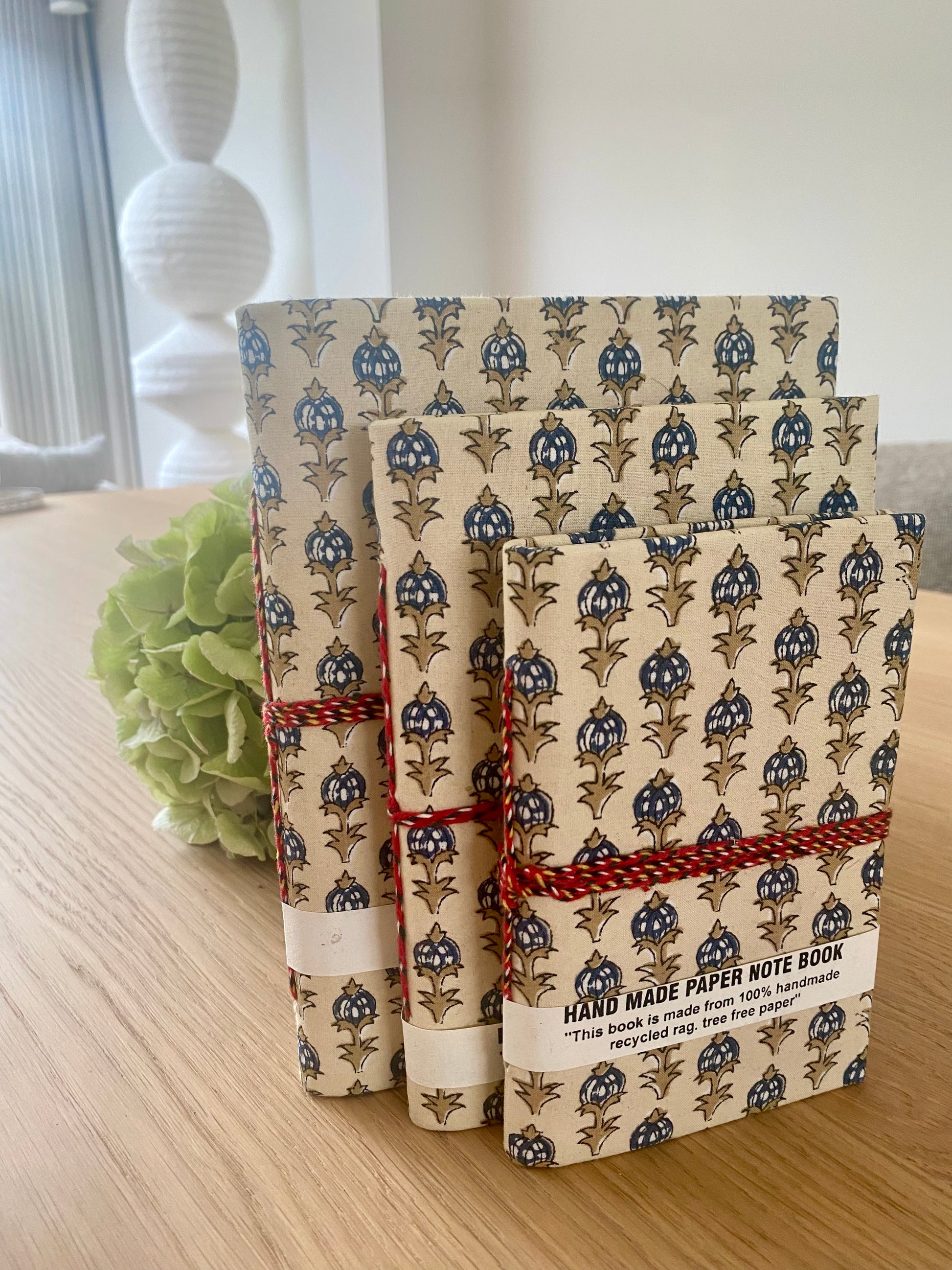 De omslag is gemaakt van authentieke blockprint-stof, zorgvuldig hergebruikt uit traditionele Indiase textiel. Daardoor is elk boekje uniek in kleur en patroon – geen enkel exemplaar is hetzelfde! Deze set heeft een betoverend ontwerp met een Indiaas design, met de hand geselecteerd in een atelier in India.