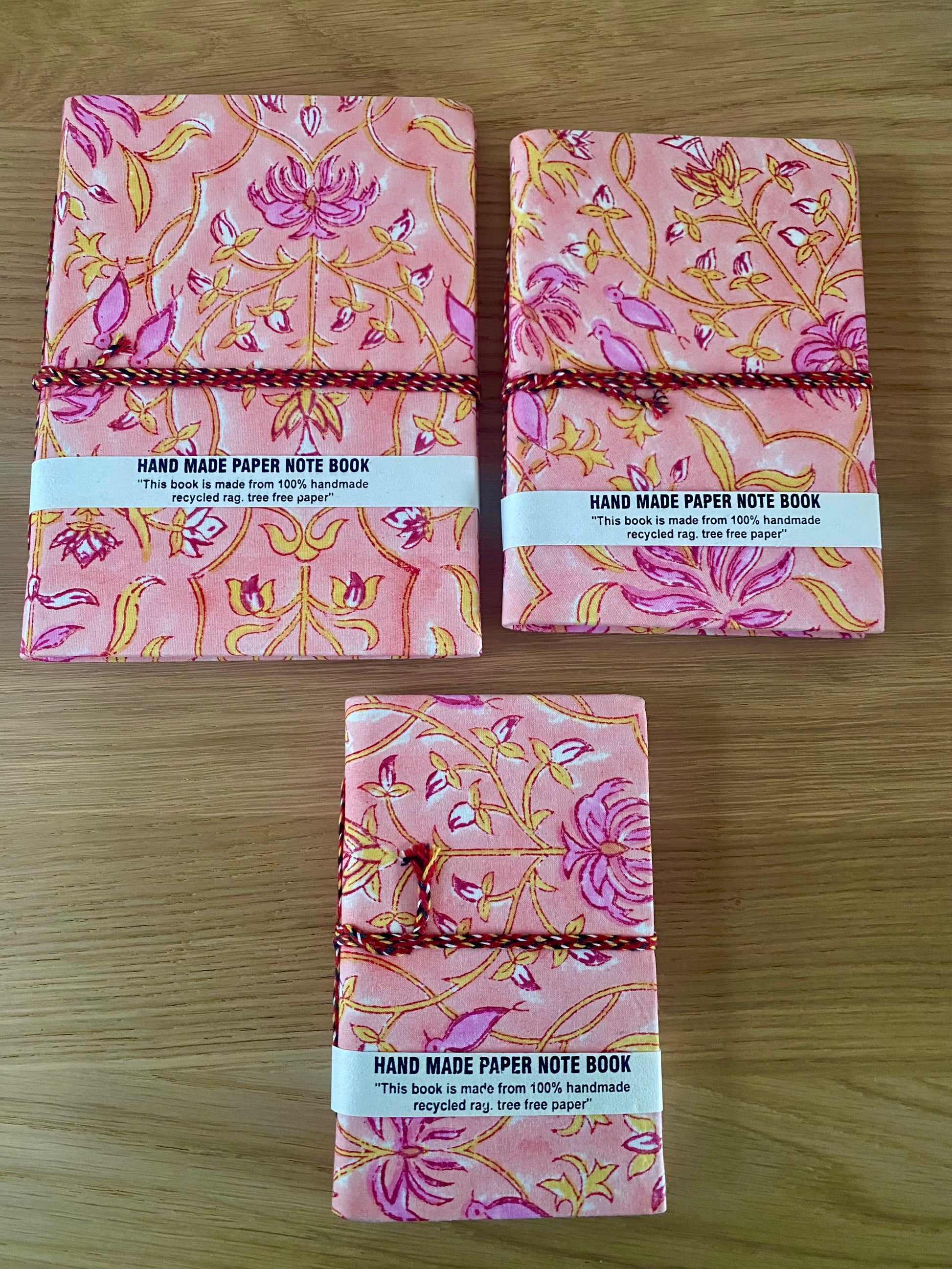 De omslag is gemaakt van authentieke blockprint-stof, zorgvuldig hergebruikt uit traditionele Indiase textiel. Daardoor is elk boekje uniek in kleur en patroon – geen enkel exemplaar is hetzelfde! Deze set heeft een geweldig roze, botanische afdruk met bloemen en vogels. Met de hand geselecteerd in een atelier in India.