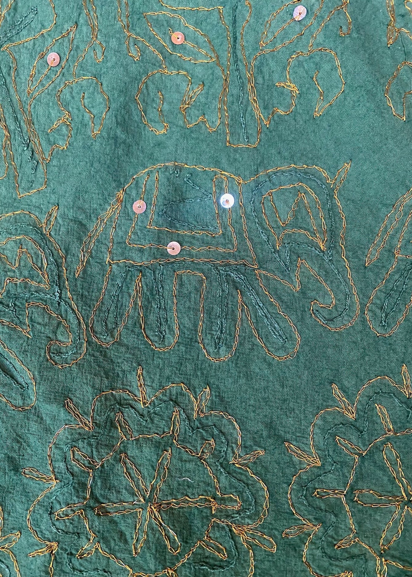 Breng warmte, sfeer en vakmanschap in huis met deze prachtige, handgemaakte kerst sprei. De diepe kerstgroene tint is rijk gedecoreerd met met de hand opgenaaide goudkleurige figuren, waardoor elke sprei een uniek kunstwerk wordt. De subtiele, glinsterende pailletten zorgen voor een feestelijke schittering en maken deze sprei perfect voor de wintermaanden, de feestdagen of als luxe accent in je interieur.
