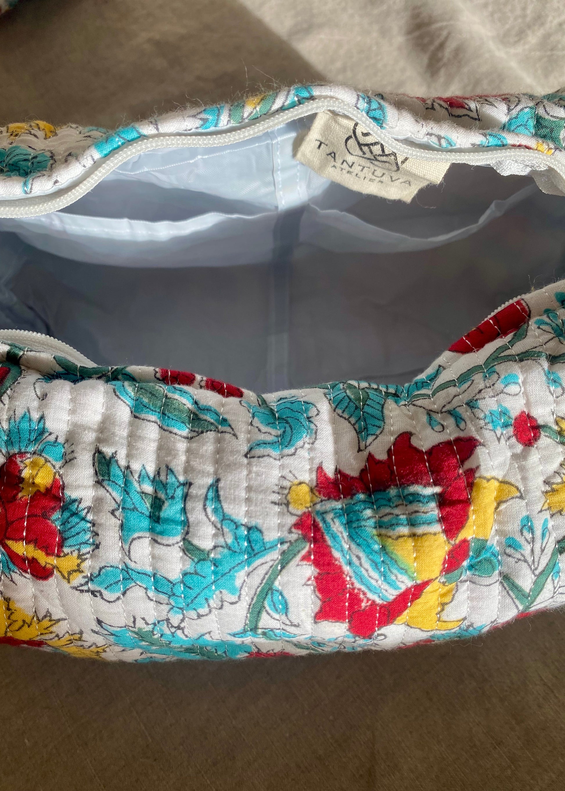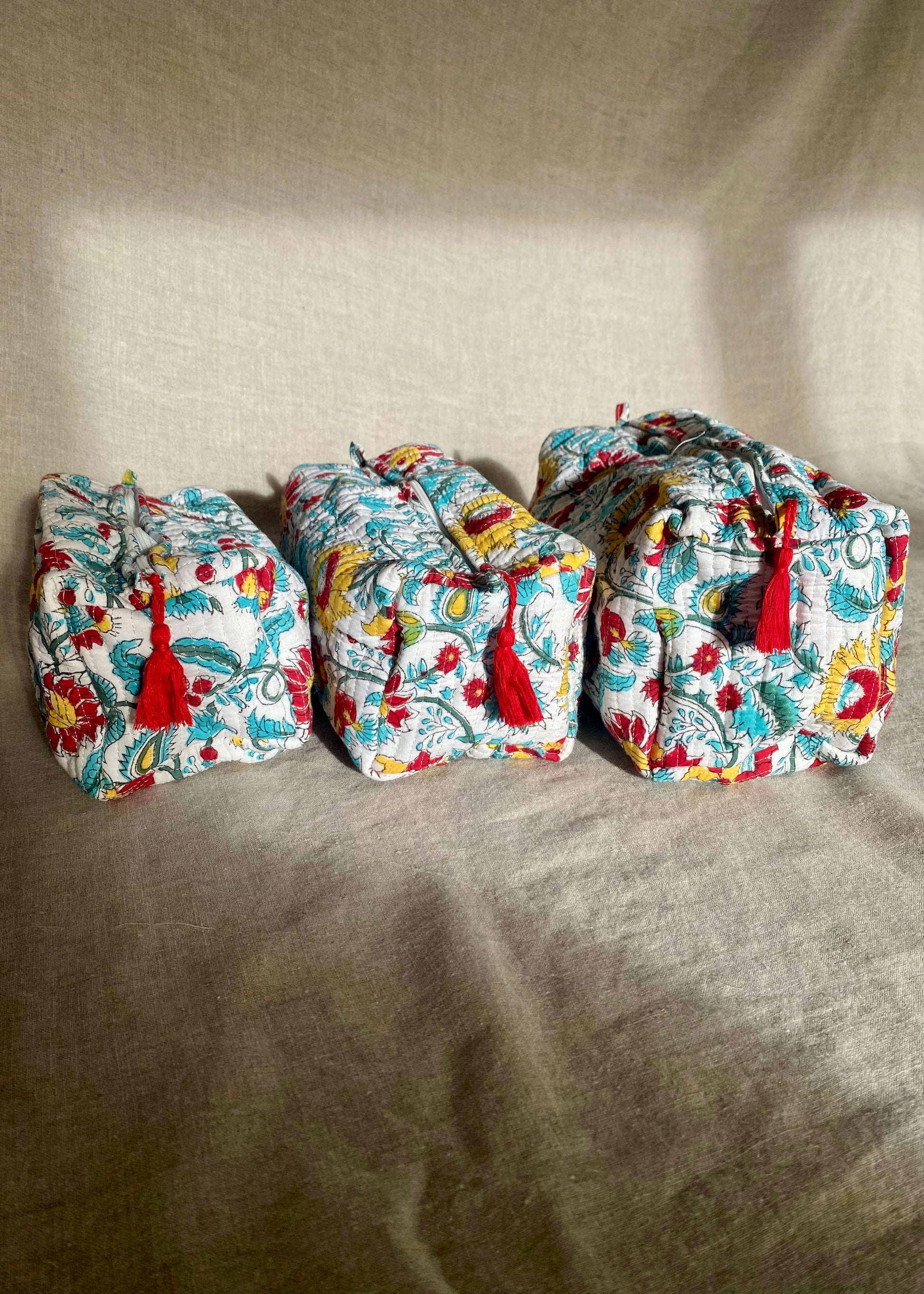 Elke block printed toilettas is met de hand bestempeld in een atelier in India, wat elke set uniek maakt. Gemaakt van 100% gewatteerd katoen, stevig van buiten en voorzien van vier handige binnenvakjes om al je essentials netjes te organiseren.