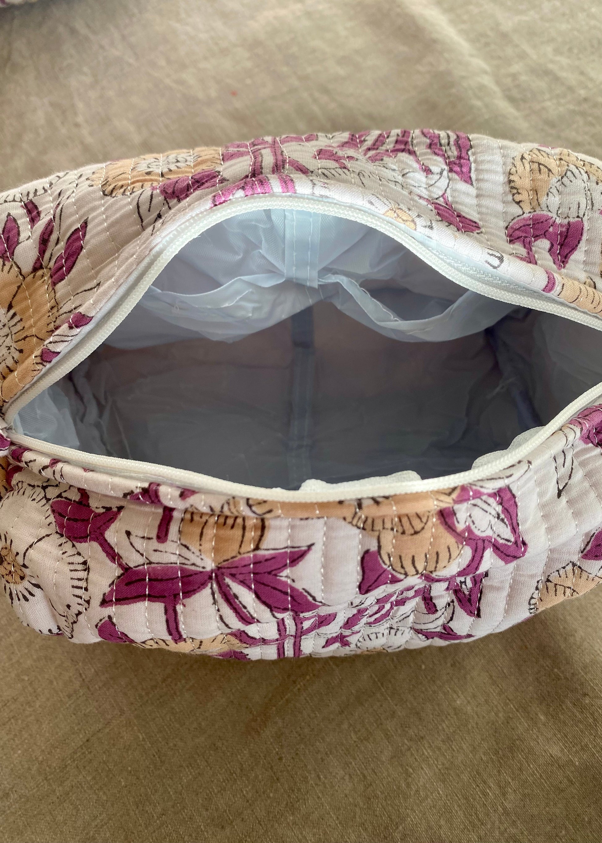 Elke block printed toilettas is met de hand bestempeld in een atelier in India, wat elke set uniek maakt. Gemaakt van 100% gewatteerd katoen, stevig van buiten en voorzien van vier handige binnenvakjes om al je essentials netjes te organiseren.