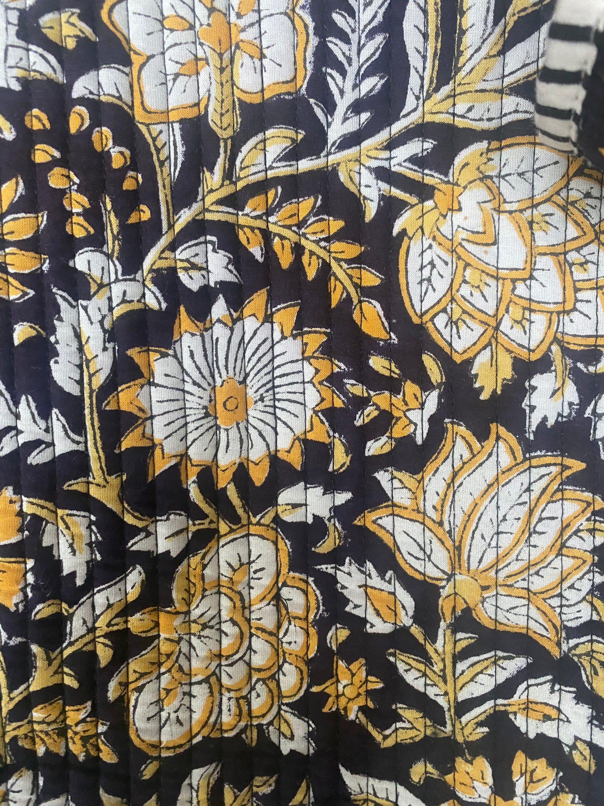 Deze unieke tote bag brengt de sfeer van een Indiase bloementuin tot leven. Het design bestaat uit geel, witte bloemen op een zwarte, katoenen basis. Ook het binnendesign is een echte eye-catcher! Het resultaat is een tas die zowel kleurrijk als stijlvol is.