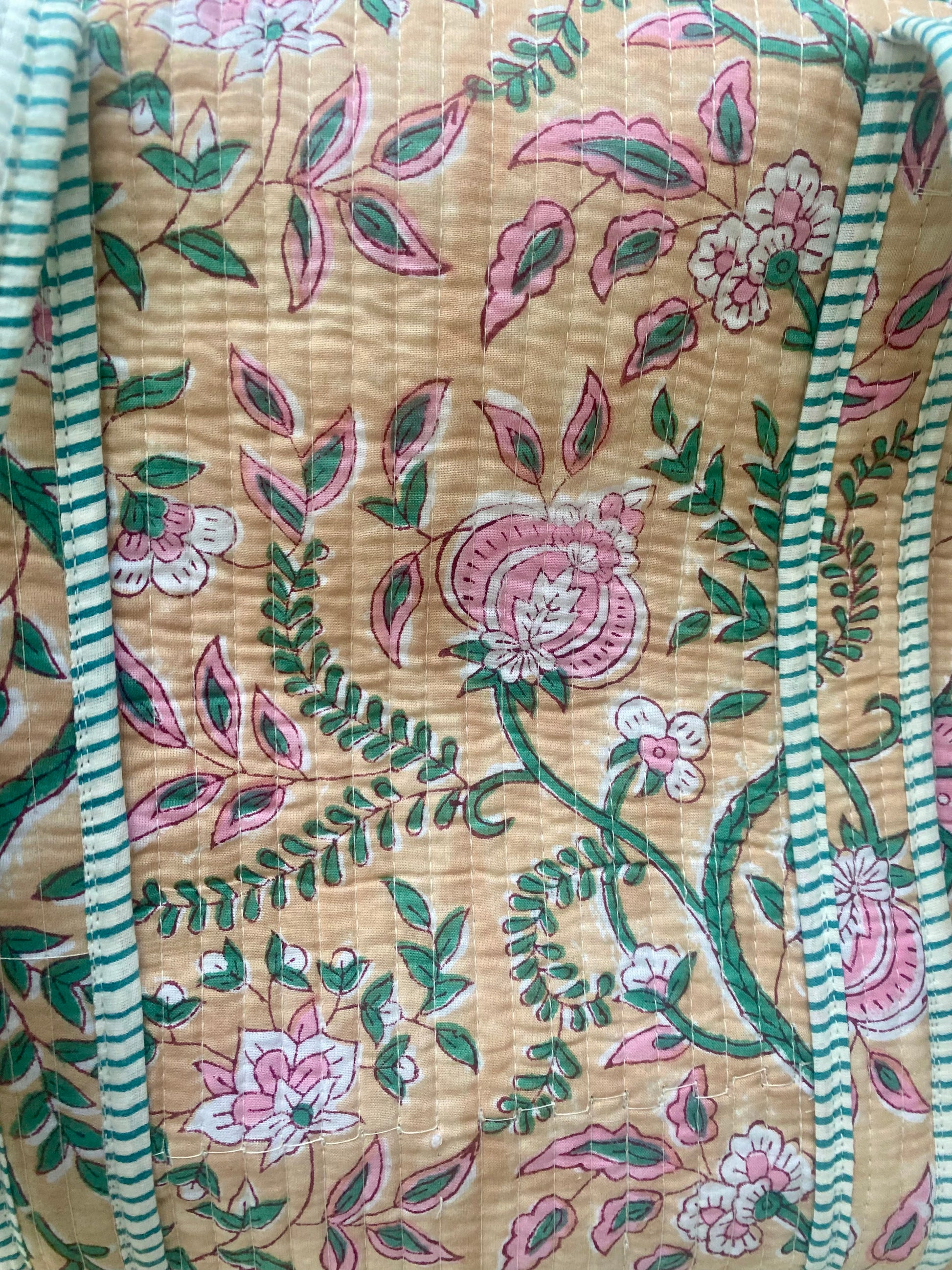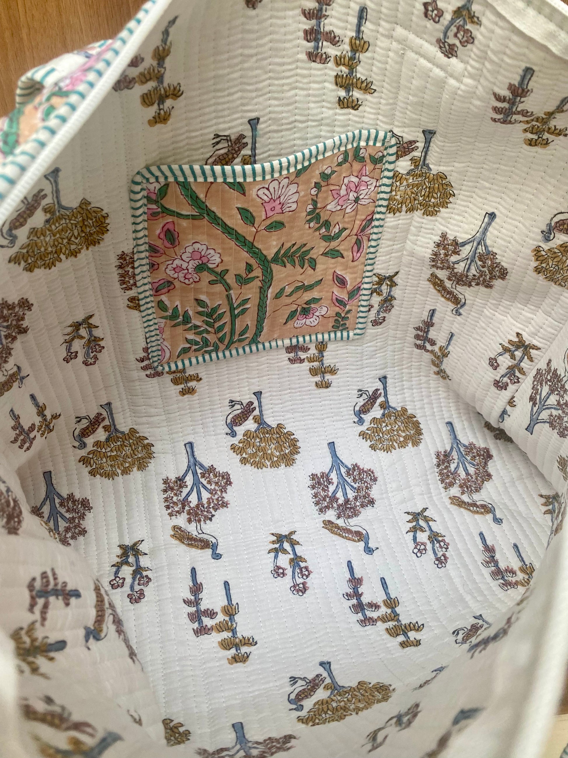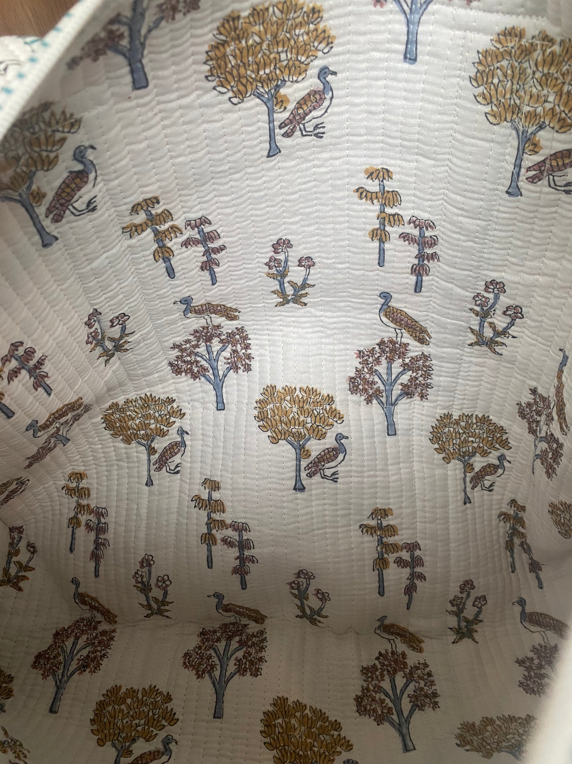 Deze bijzondere tote bag is van binnen én buiten een kunstwerk. De tas is gemaakt van stevig 100% katoen en is licht gewatteerd voor extra comfort en stevigheid. Aan de buitenzijde schittert een bloemenpatroon in roze, wit en groen op een zachte peachkleurige achtergrond, terwijl de binnenzijde je verrast met een wit design vol bomen en vogels. Een tas die twee verhalen vertelt – stijlvol, uniek en veelzijdig.