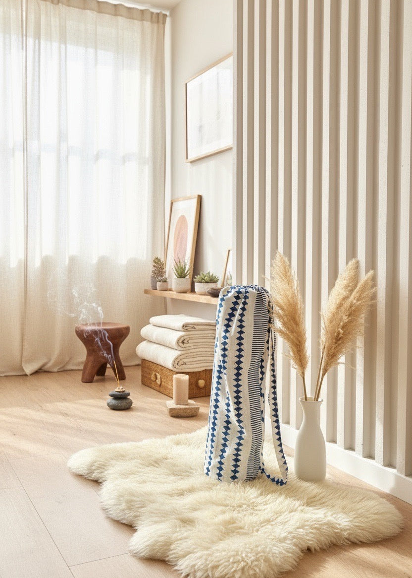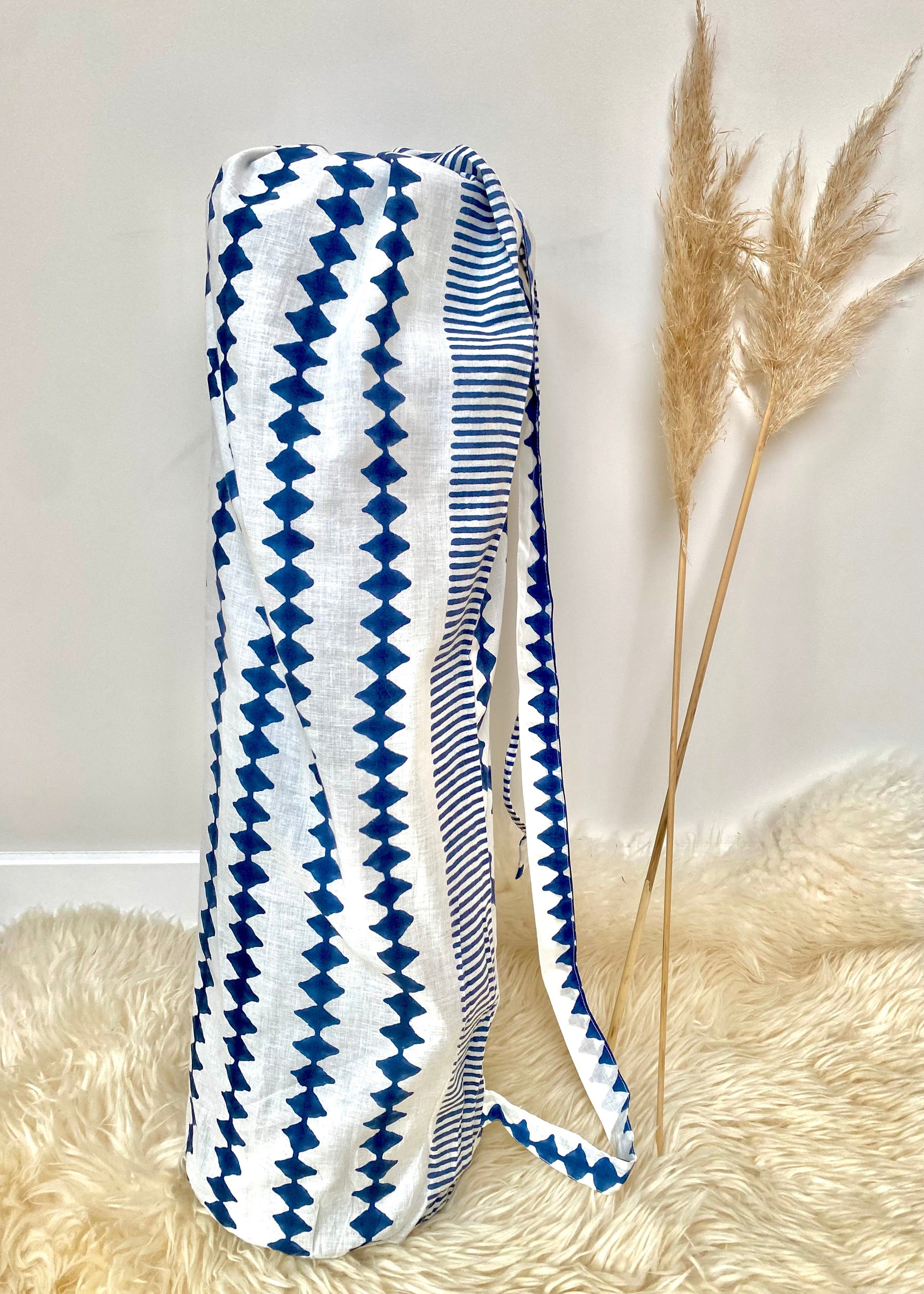 Deze yogatas is niet alleen super handig, maar ook duurzaam en handgemaakt! 100% natuurlijk katoen en met houten stempels bedrukt in India. Door het handwerk is iedere tas weer net anders, dat maakt het zo bijzonder. Praktisch iedere yogamat of bolster past erin, met nog genoeg ruimte voor een handdoek of vestje. Afmetingen: 72x34cm.